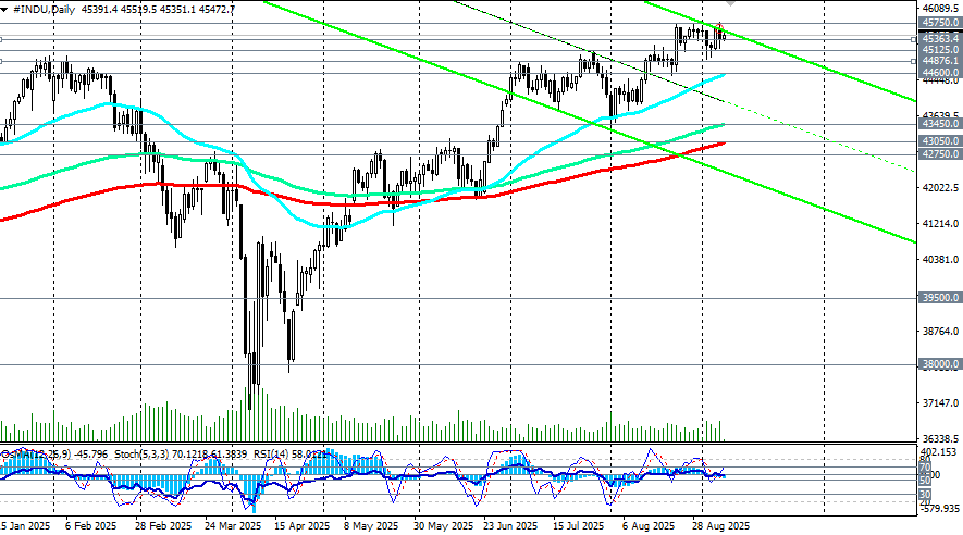 С технической же точки зрения, фьючерсы на индекс Dow Jones Industrial Average торгуются в зоне устойчивого бычьего рынка. Наиболее вероятен дальнейший рост с ближайшей целью вблизи недавнего и рекордного максимума 45750.00. Если данные по инфляции, ожидаемые в среду и четверг, укажут на ее замедление, то вероятность дальнейшего снижения процентных ставок ФРС и роста фондовых индексов США повысится.