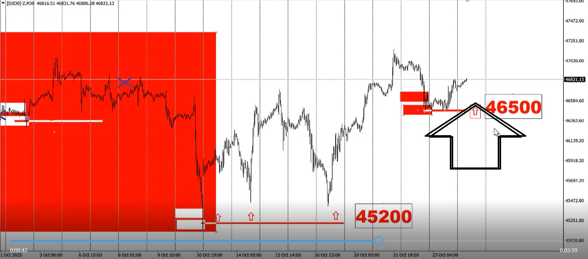 Продавцы доллара продолжают удерживать область 99,50 - 100 в статусе сопротивления, и более того, что провоцирует покупателей к действиям и дальнейшему перетоку капитала в Dow Jones. При этом возвращение к целевой области 46500 - 46800 для американского рынка акций станет поводом для новых вливаний активов со стороны покупателей и Dow Jones.