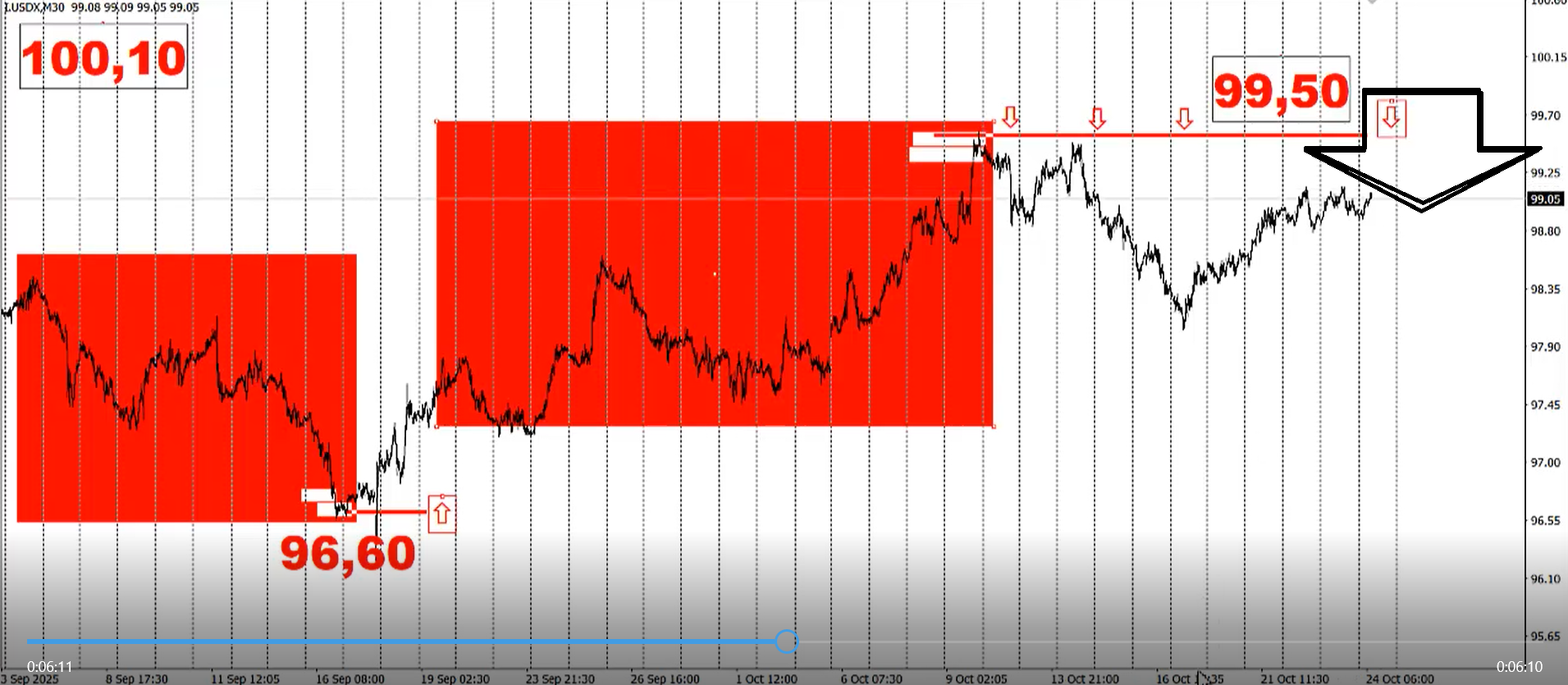Статья содержит демонстрацию актуальных целей для работы c американским долларом (Индекс USD) на 24 - 27 ОКТЯБРЯ 2025 года, а также в конце статьи наглядная иллюстрация целей для торговли в Gold, Биткоин, Dow Jones и в котировках EUR/USD, GBP/USD (видео версия статьи в конце).