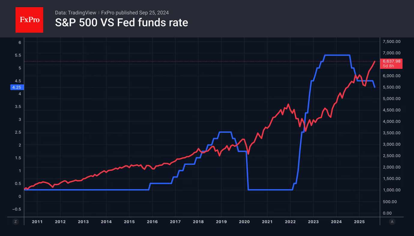 Падение фондовых индексов США напоминает распродажу на фактах после масштабной покупки на слухах. ФРС снизила ставку по федеральным фондам. После роста S&P 500 на информации о сделках Oracle и NVIDIA с OpenAI управляющие активами купили американских акций на $58 млрд. Речь идёт о самом крупном притоке с начала года. Он выглядит логично на фоне многочисленных рекордных максимумов широкого фондового индекса.