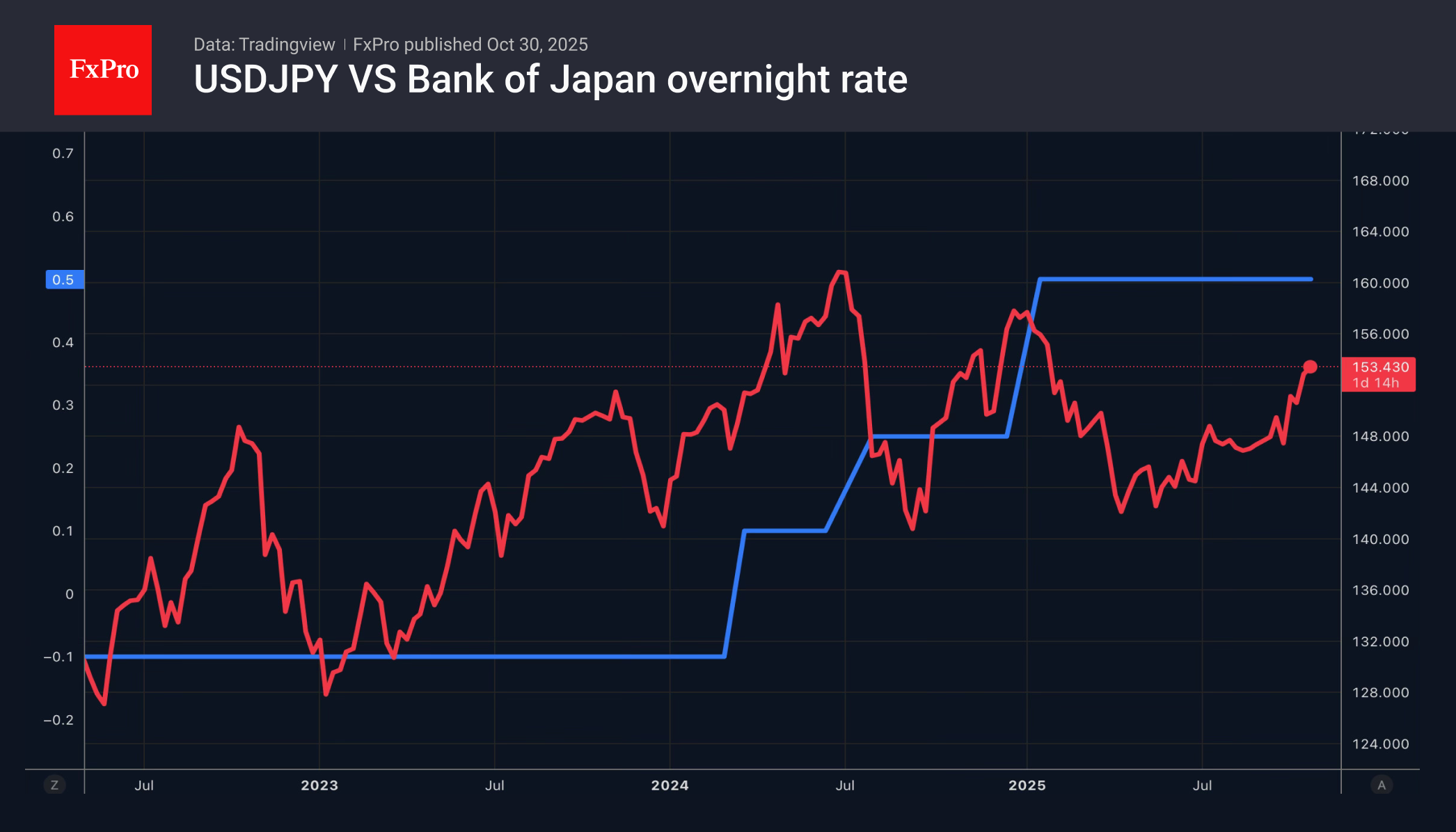 Возобновила снижение и иена. Банк Японии сохранил ставку овернайт на прежнем уровне 0,5% на своём октябрьском заседании и отказался подавать сигналы о её дальнейшей судьбе. Наряду с «ястребиной» риторикой ФРС, это подбросило котировки USDJPY вверх.