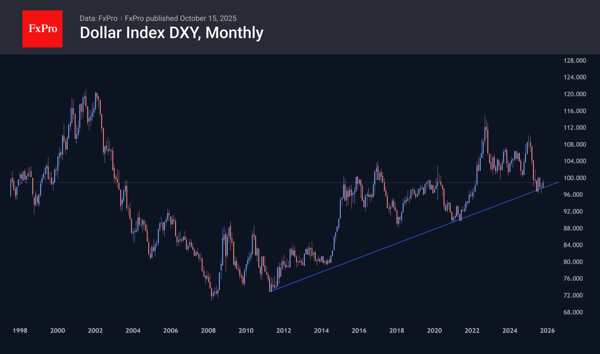 Однако текущий момент очень важен с исторической точки зрения. DXY с лета курсирует вблизи линии поддержки 13-летнего аптренда. Провал доллара под уровень 96 будет выглядеть как слом многолетнего цикла роста, что в последний раз происходило 2002, а до этого – в 1985-м и 1969-м, когда доллар терял примерно 40%, 50% и 30% от пика до дна. В текущих условиях это может быть снижение к минимумам 2008 года, когда DXY был близок к 70 или даже движение под эти исторические минимумы.