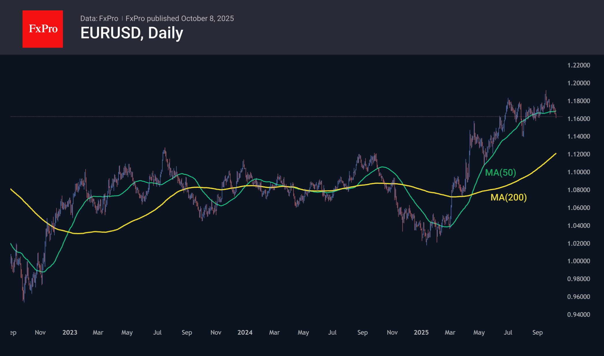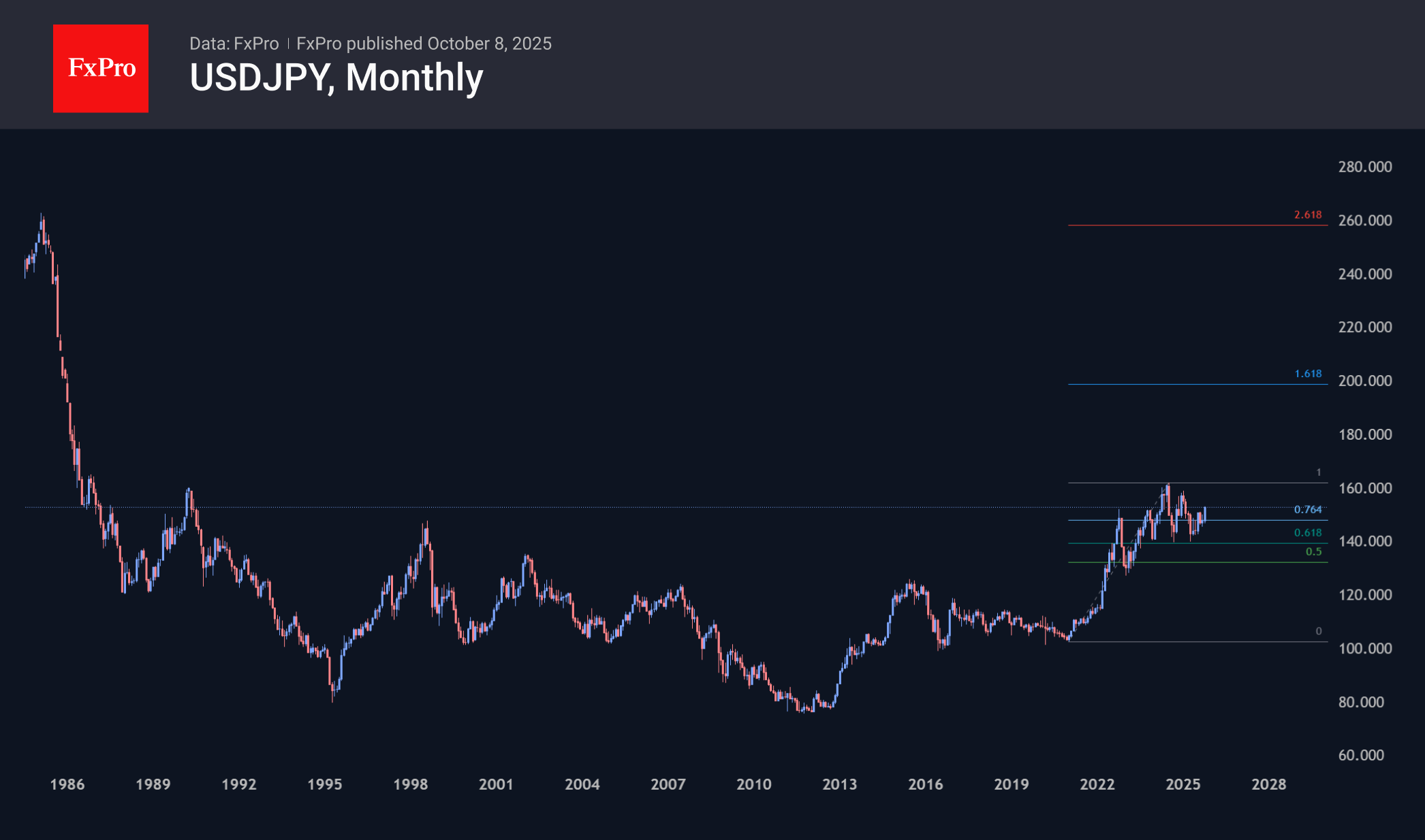 Смена лидера крупнейшей партии Японии запустила распродажу иены. К минимумам в конце прошлой недели USDJPY прибавила уже 4.5%, дойдя до 152.8 – максимума с февраля. Санаэ Такаити обещает стимулировать экономику через госрасходы и мягкую монетарную политику. В результате доходности долгосрочных гособлигаций обновляют исторические максимумы, так как инвесторы предвидят рост размещений и опасаются проблем с обслуживанием госдолга. Валюта, как естественный стабилизатор подобных дисбалансов, как правило снижается. Аналогичный импульс мы видели в 2022, вызвавший рост USDJPY примерно на треть за семь месяцев. Не ожидая подобного размаха на этот раз, мы всё же предполагаем развитие роста вплоть до области последних максимумов на 159–162, а сохранение аналогичной политики на длительный срок может увести пару на 200.