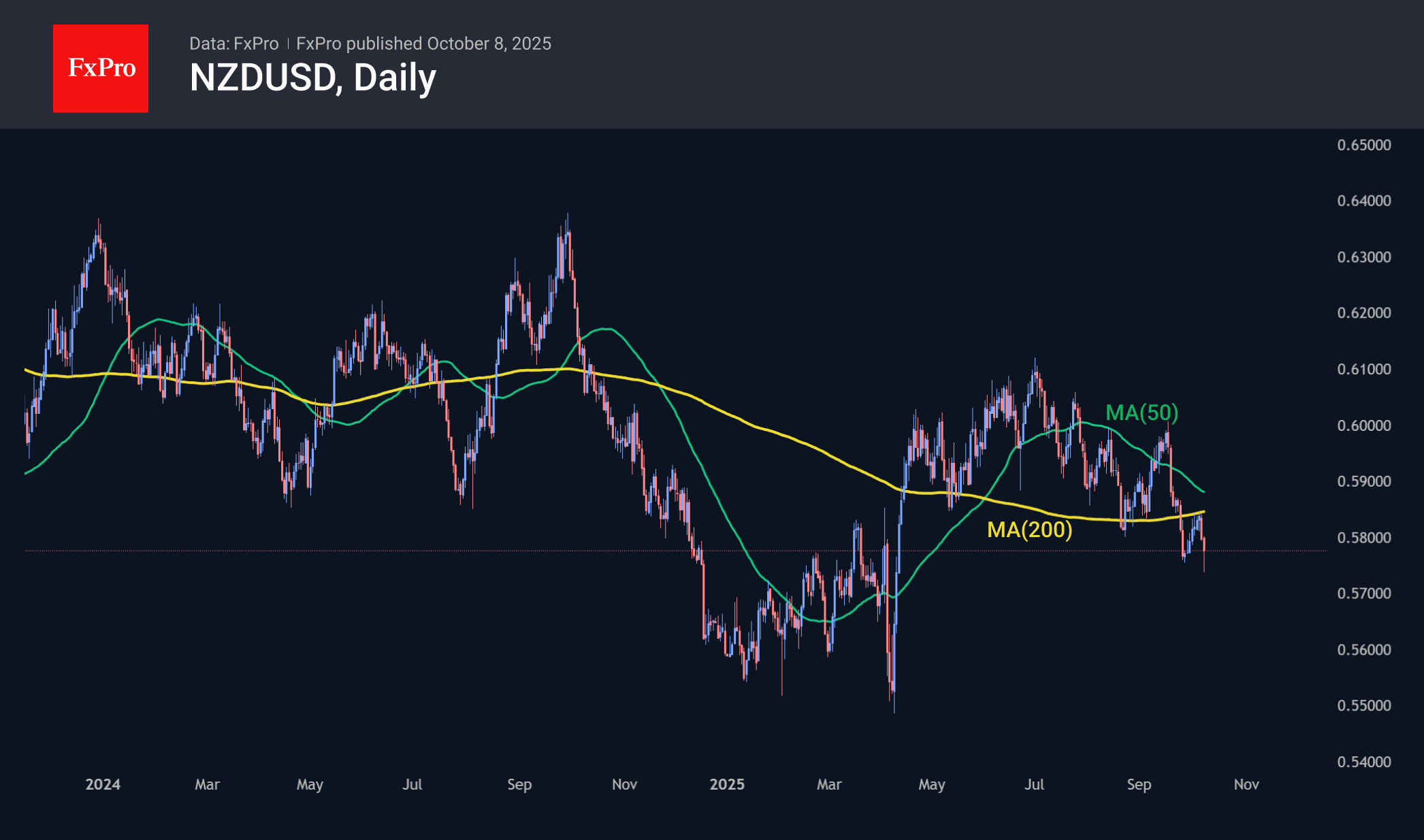 Последней новостью стало довольно неожиданное снижение ключевой ставки РБНЗ на четверть процентного пункта, что отняло у NZDUSD около 1% сразу после оглашения решения. Хотя сейчас пара восстановила примерно половину изначальных потерь, она переписала минимумы за полгода, опустившись до 0.5730. В паре формируется «крест смерти», медвежий сигнал технического анализа, когда 50-дневная скользящая средняя опускается под 200-дневную. Этот сигнал усилен тем, что обе эти кривые находятся над ценой. За таким сигналом часто распродажа становится более интенсивной. Однако и без такого сигнала пара движется в понижательном канале с начала июля, касаясь его нижней границы две недели назад и сегодня.