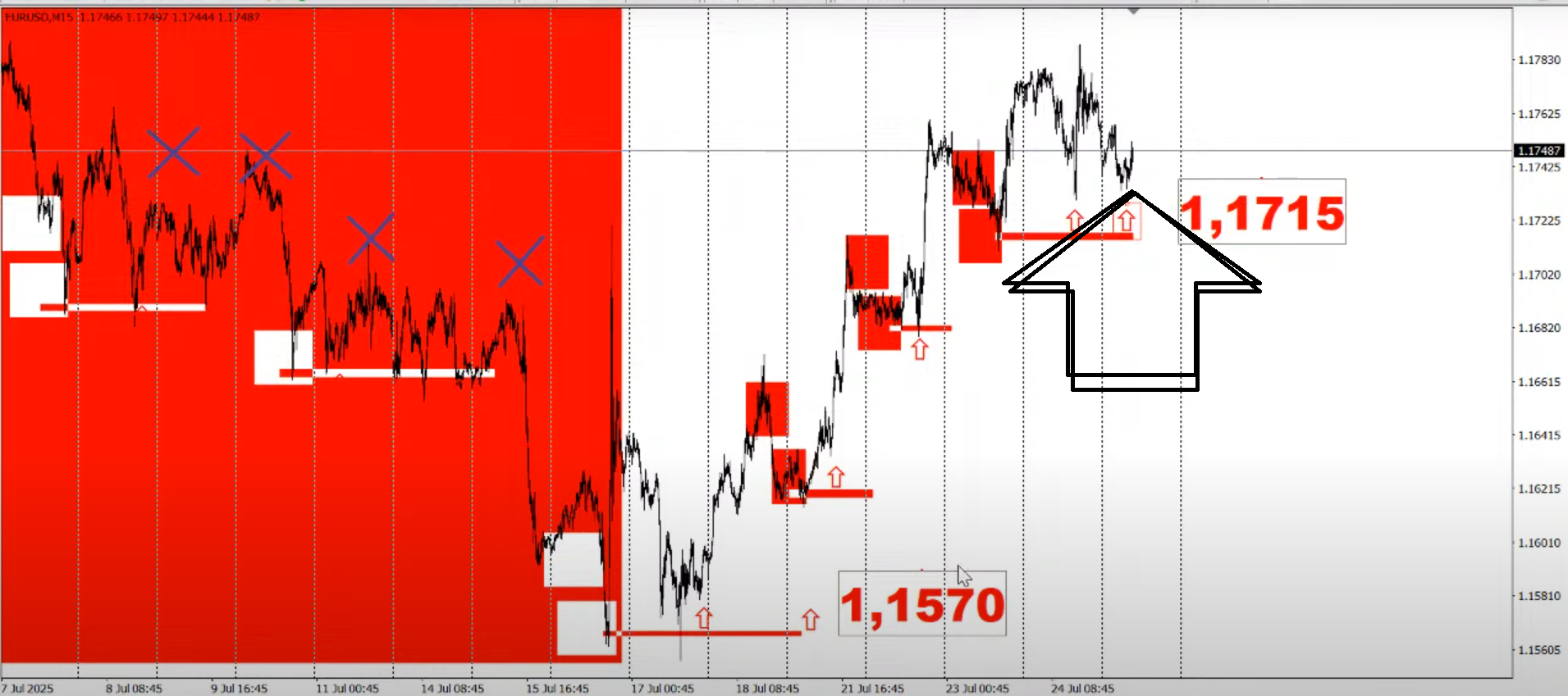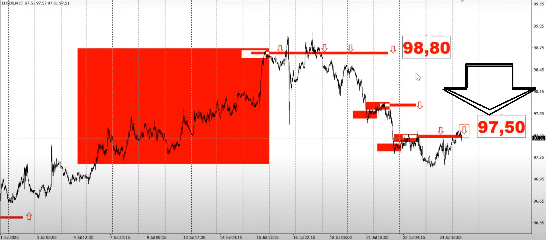 Статья содержит демонстрацию актуальных целей для работы c американским долларом (Индекс USD) на 25 - 28 ИЮЛЯ 2025 года, а также в конце статьи наглядная иллюстрация целей для торговли в Gold, Биткоин, Dow Jones и в котировках EUR/USD, GBP/USD (видео версия статьи в конце).