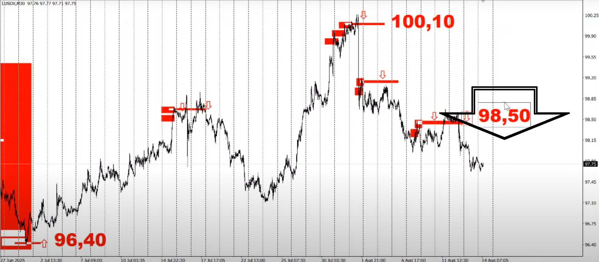 Статья содержит демонстрацию актуальных целей для работы c американским долларом (Индекс USD) на 14 -15 АВГУСТА 2025 года, а также в конце статьи наглядная иллюстрация целей для торговли в Gold, Биткоин, Dow Jones и в котировках EUR/USD, GBP/USD (видео версия статьи в конце).