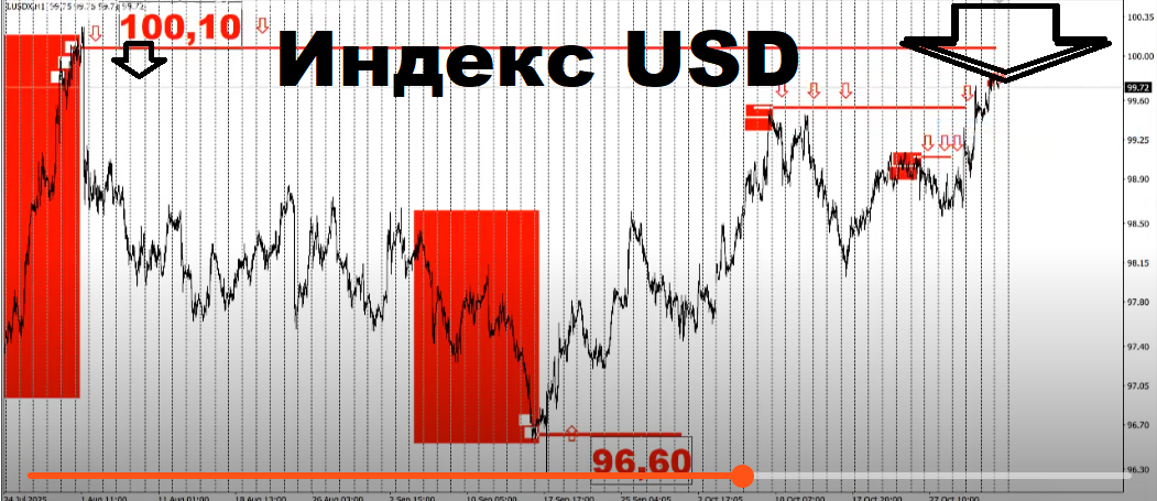 Статья содержит демонстрацию актуальных целей для работы c американским долларом (Индекс USD) на 4 - 6 НОЯБРЯ 2025 года, а также в конце статьи наглядная иллюстрация целей для торговли в Gold, Биткоин, Dow Jones и в котировках EUR/USD, GBP/USD (видео версия статьи в конце).