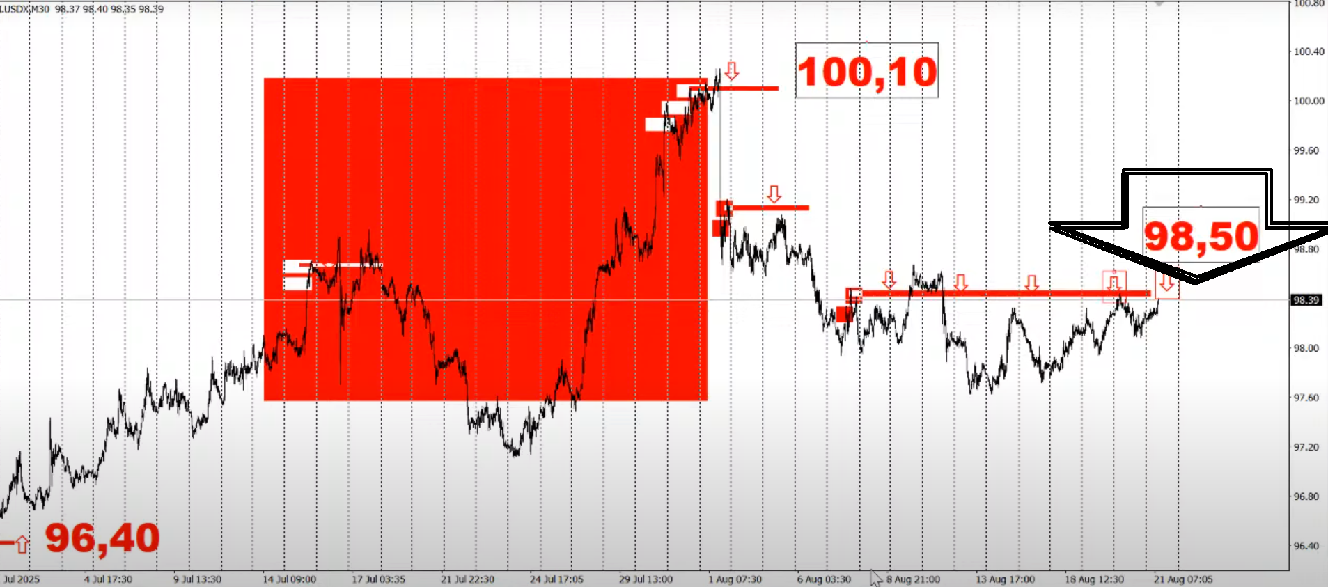 Статья содержит демонстрацию актуальных целей для работы c американским долларом (Индекс USD) на 22 АВГУСТА 2025 года, а также в конце статьи наглядная иллюстрация целей для торговли в Gold, Биткоин, Dow Jones и в котировках EUR/USD, GBP/USD (видео версия статьи в конце).