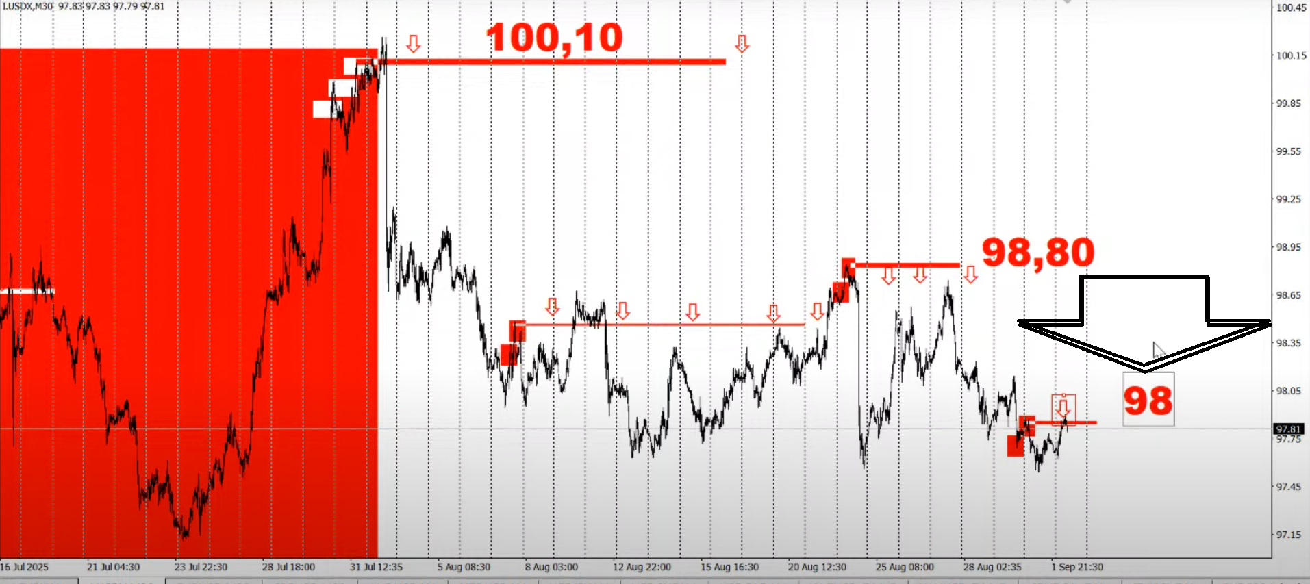 Статья содержит демонстрацию актуальных целей для работы c американским долларом (Индекс USD) на 3 - 5 СЕНТЯБРЯ 2025 года, а также в конце статьи наглядная иллюстрация целей для торговли в Gold, Биткоин, Dow Jones и в котировках EUR/USD, GBP/USD (видео версия статьи в конце).