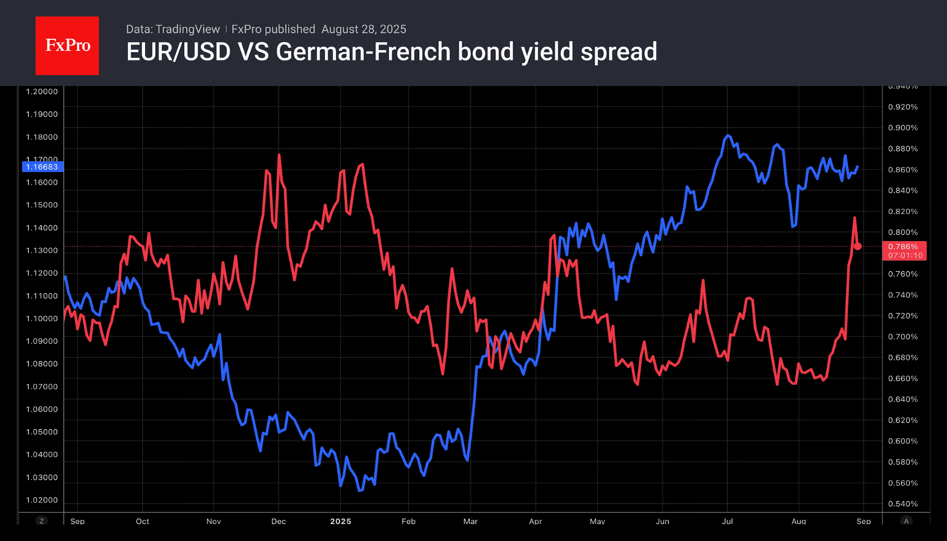 Падению индекса USD препятствуют проблемы конкурентов. Правительство Нидерландов пережило вотум недоверия, правительству Франции это вряд ли удастся сделать в сентябре. Рост политических рисков чреват расширением дифференциала доходности облигаций Франции и Германии до максимальных отметок с 2012. Это внушительный встречный ветер для EURUSD.