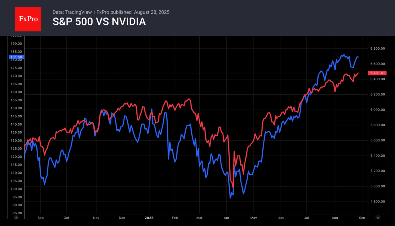 S&P 500 установил новый рекордный максимум в ожидании сильной корпоративной отчётности NVIDIA. Прибыль и ожидаемая выручка порадовали инвесторов. Продажи в важном сегменте обработки данных разочаровали. Как и новость об отсутствии продаж чипа H20 AI клиентам из Китая. В результате выручка за квартал сократилась на $4 млрд. Чрезмерно завышенные ожидания не оправдались, и мы видим очередной пример «покупки слухов, продажи фактов».