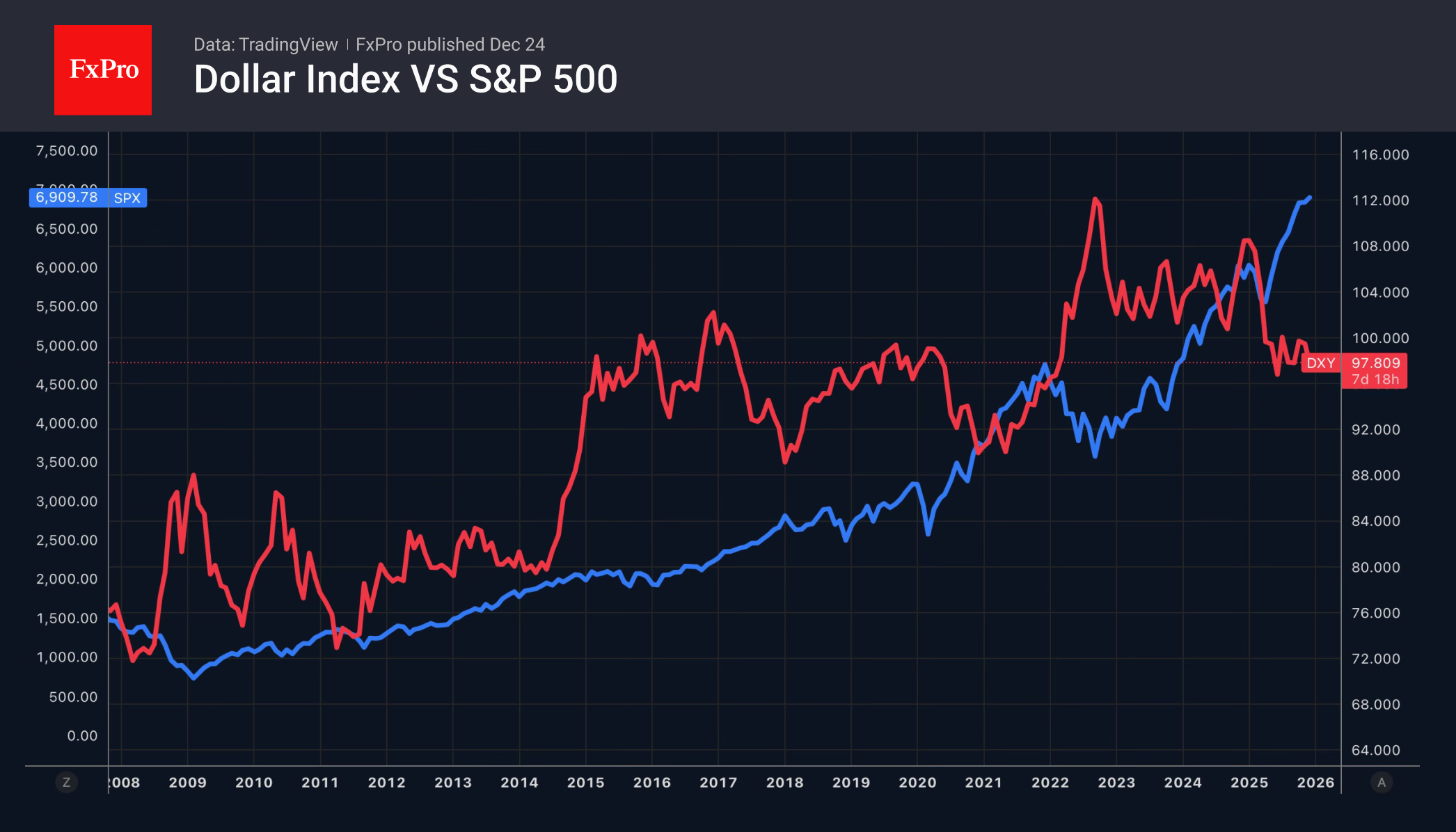 В таких условиях лучше всего себя чувствуют доходные валюты. Британский фунт достиг максимальной отметки против гринбэка за три месяца, австралийский доллар – за 14. После того, как Резервный банк подал сигнал о завершении цикла ослабления денежно-кредитной политики, срочный рынок начал закладывать ожидания повышения ставки в 2026. К Рождеству сроки старта монетарной рестрикции сместились на июнь, создавая попутный ветер для Осси.