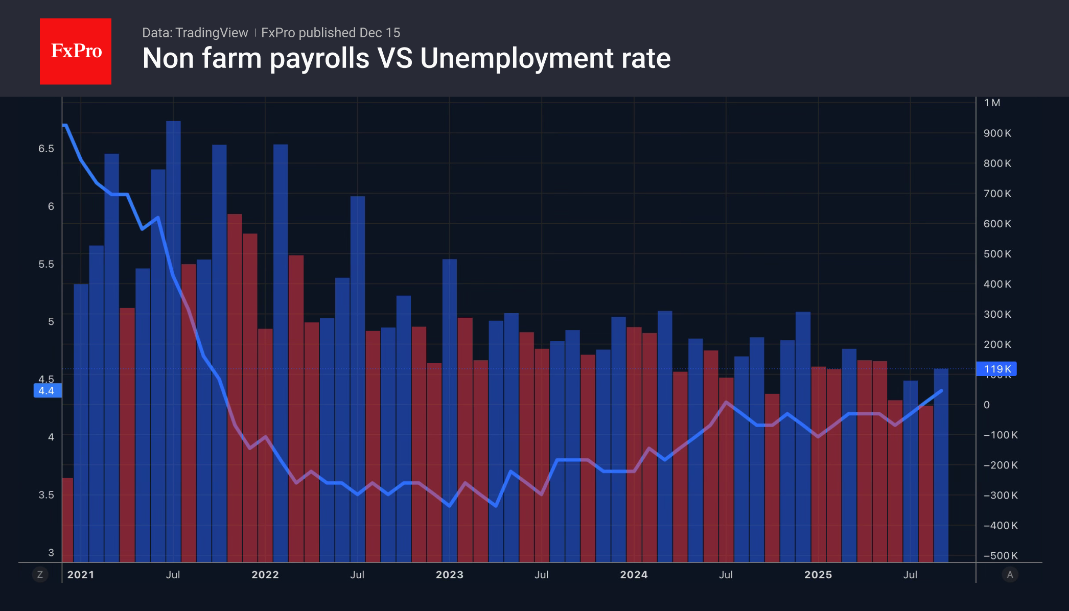 Американский доллар консолидируется в преддверии важной статистики по рынку труда. Эксперты Bloomberg прогнозируют увеличение занятости на 50 тыс. в ноябре и сохранение безработицы на 4.4%, самом высоком уровне с 2021 года. Такая статистика оправдает паузу в снижении ставки до марта-апреля, на которую сейчас закладывается срочный рынок.