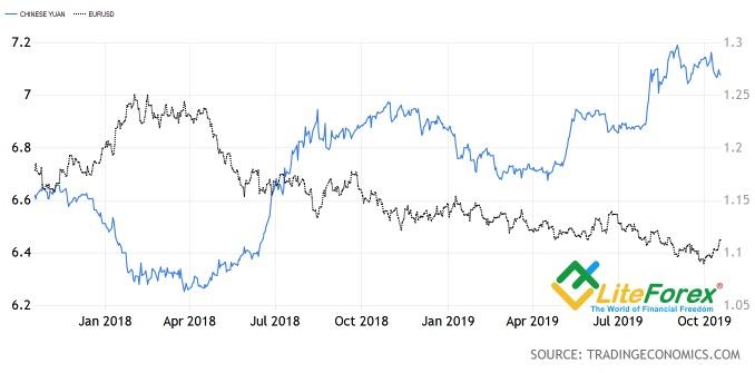 В силу высокой доли экспорта в валовом внутреннем продукте, еврозона справедливо относится к числу наиболее пострадавших от торговых войн регионов. Сокращение внешнего спроса, в первую очередь со стороны Китая, ухудшает позиции европейских компаний, ориентированных на продажи за рубеж. В этом отношении информация о замедлении экономики Поднебесной до 6% в третьем квартале, что является худшей динамикой за последние три десятка лет, - негатив для евро. Тем не менее, в сентябре китайские розничные продажи и промышленное производство порадовали, а прогресс в отношениях Вашингтона и Пекина позволяет надеяться на прекращение торговых трений. Лучшим индикатором рыночных настроений является юань. Его корреляция с евро в последние годы возросла, что еще раз доказывает чувствительность единой европейской валюты к конфликту США и Поднебесной.