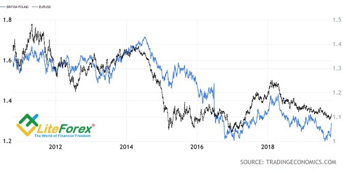 С января по сентябрь единая европейская валюта потеряла 5,2% своей стоимости против доллара США на фоне замедления экономики еврозоны, причины которого следует искать в торговых войнах и Brexit. Развод с ЕС дорого обходится Туманному Альбиону, однако и Европейский союз чувствует боль от нарушения экономических взаимосвязей. Германия стоит на грани рецессии, а немецкий Минфин не устает снижать прогнозы роста ВВП. Он ожидает, что показатель в 2020 вырастет не на 1,5%, а на 1%.
