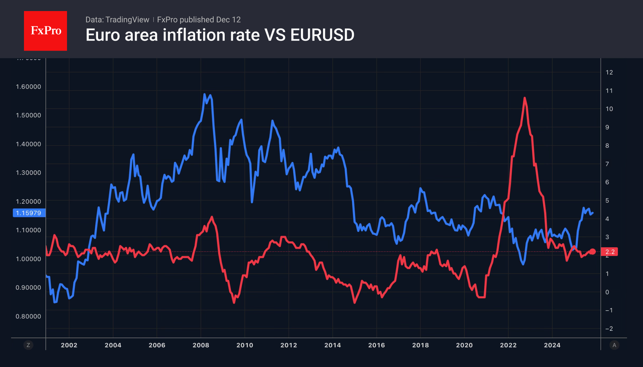 Ослабление американского доллара после «ястребиного» среза ФРС не оставляет равнодушными другие центробанки. Обычно они следуют за Федрезервом как вожаком стаи, так как его решения влияют на курс гринбэка и темпы инфляции во всем мире. ЕЦБ прогнозирует, что потребительские цены замедлятся до 1.7% в 2026 и вернутся к таргету в 2% в 2027. При этом ралли EURUSD на более чем 13% с начала 2025 угрожает этому плану.