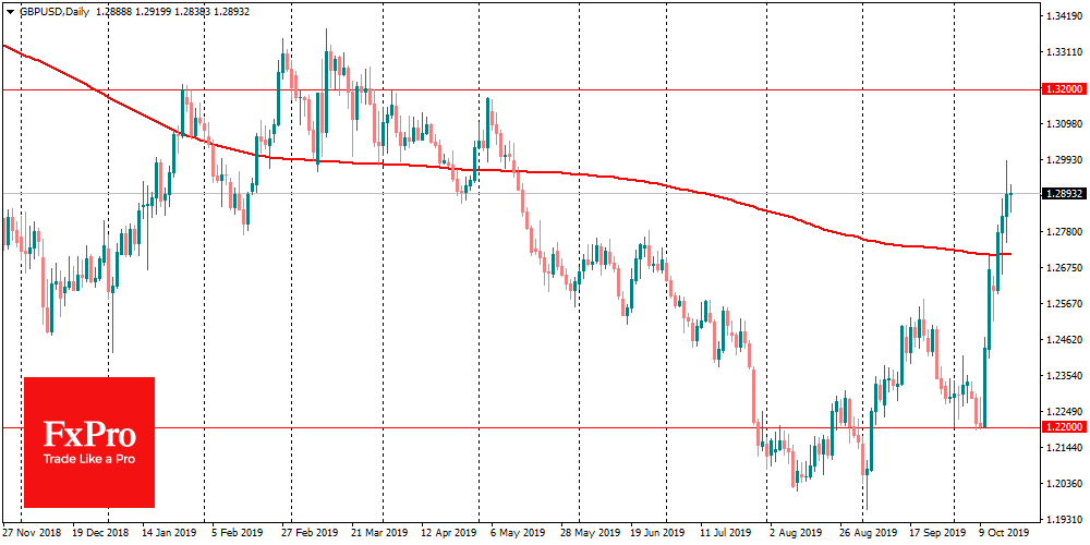 Сделка лидеров стран ЕС и Великобритании способствовала укреплению британской валюты к доллару более чем на 6%, до 1.30 на пике роста в четверг. Впрочем, достижение договоренностей между Британией и ЕС еще не гарантирует, что Brexit состоится 31 октября. Соглашение еще должно быть одобрено в субботу британским парламентом. Так что вокруг стерлинга до сих пор сохраняется неопределенность.