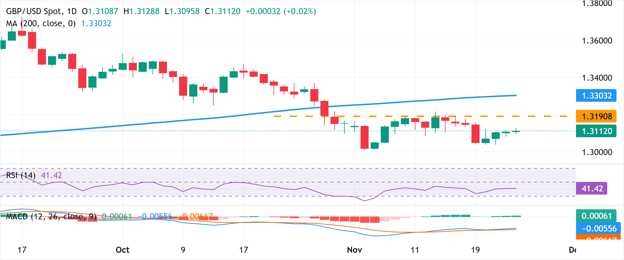 Пара GBP/USD привлекает покупателей четвертый день подряд и удерживается выше круглого уровня 1,3100 в первой половине европейской сессии во вторник. Трейдеры решают уменьшить свои медвежьи ставки по британскому фунту (GBP) перед осенним бюджетом Великобритании в среду. Доллар США (USD), с другой стороны, продолжает свою консолидацию цен на фоне смешанных сигналов от чиновников Федеральной резервной системы (ФРС) и оказывается еще одним фактором, создающим попутный ветер для спотовых цен. Тем не менее, неопределенность вокруг фискального заявления канцлера Великобритании Рейчел Рейвз может сдерживать дальнейшее укрепление валютной пары.