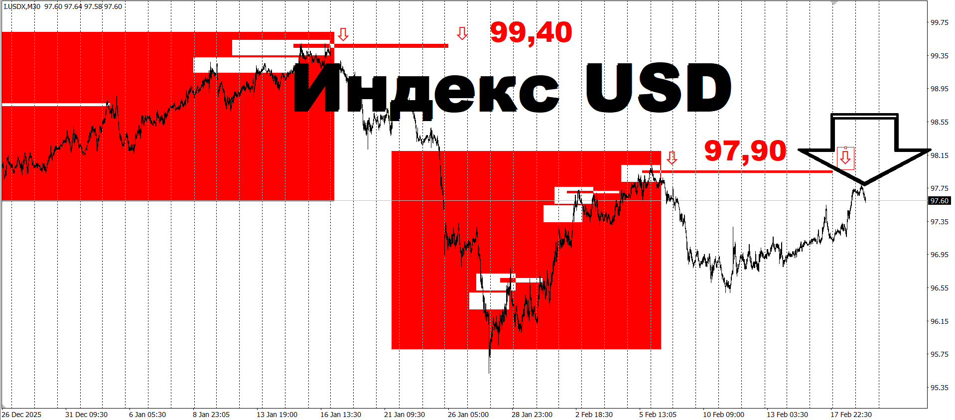 Продавцы USD продолжают активизировать свои усилия при возвращении его цен к максимумам недели 97,50 - 97,90, что ограничивает укрепление "зеленой" валюты. При этом возможности для новых покупок именно в Gold стимулируются также и через новые импульсы к росту у других конкурентов доллара, например, на крипто-рынке в BTC/USD, EUR/USD и DowJones.