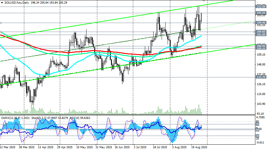 Впрочем, есть и приятные исключения на общем фоне. Так, пара SOL/USD выросла сегодня еще на 4,5%, прибавив к вчерашнему росту на 7,7% и подскочив к отметке 205.60. Рост SOL сопровождался появлением в СМИ сообщений о том, что три крупные компании ведут переговоры о создании резерва Solana на 1 млрд долларов. В сентябре, как следует из этих сообщений, на крипторынке может появиться компания, в планах которой создать стратегический миллиардный резерв Solana, что может сделать ее крупнейшей среди конкурентов.