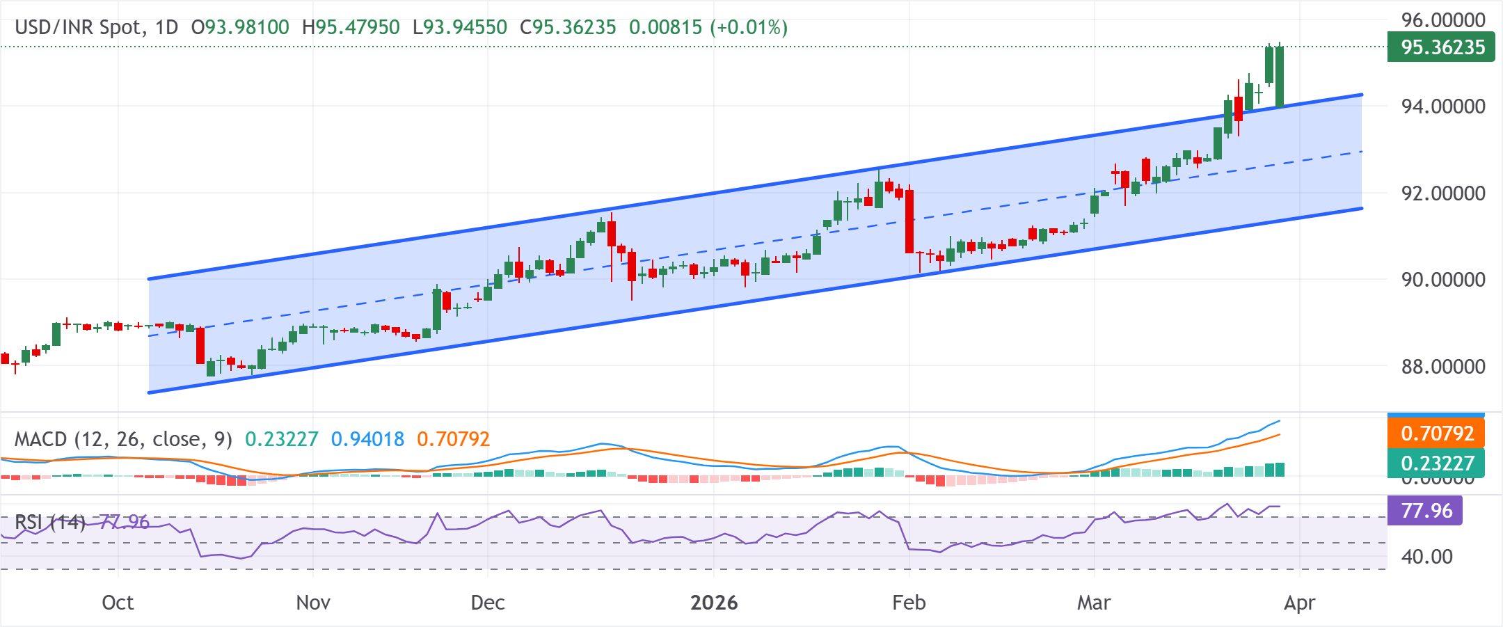 Пара USD/INR заполняет недельный медвежий гэп, опускаясь ниже уровней 94,00, а последующий рост выше психологической отметки 95,00 подтверждает недавний пробой более чем пятимесячного восходящего канала. Кроме того, индикатор схождения/расхождения скользящих средних (MACD) остается в положительной зоне с линией выше сигнальной и положительной гистограммой, поддерживая уверенный восходящий импульс.