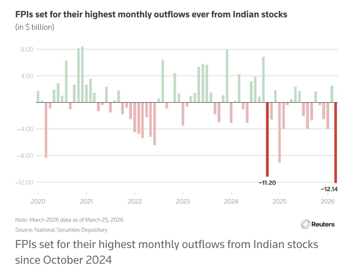 Иностранные портфельные инвесторы продавали индийские облигации рекордными темпами в марте, с чистыми продажами в размере $1,61 млрд — это самый высокий показатель с момента введения полностью доступного маршрута (FAR) шесть лет назад. Кроме того, с 28 февраля иностранные инвесторы продали чистые акции Индии на сумму $12,14 млрд, что стало крупнейшим ежемесячным оттоком за всю историю. Это способствовало почти 11%-ному падению INR с начала года до нового исторического минимума в пятницу.