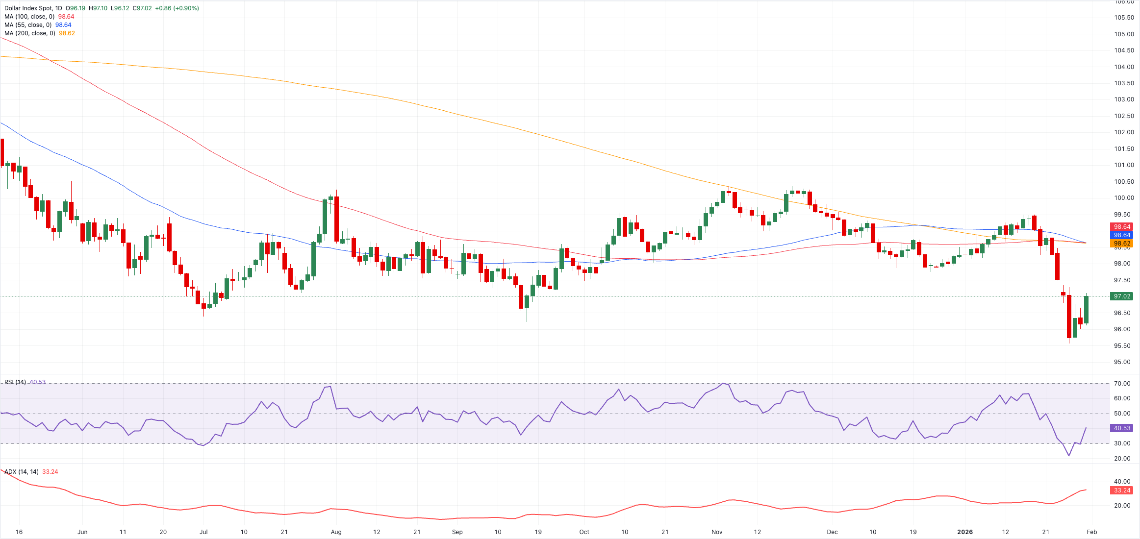 С другой стороны, быкам нужно будет снова преодолеть 200-дневную SMA, что потенциально приведет к тестированию потолка 2026 года на 99,49 (15 января). Далее находится максимум ноября 2025 года на 100,39 (21 ноября) перед максимумом мая 2025 года на 101,97 (12 мая).