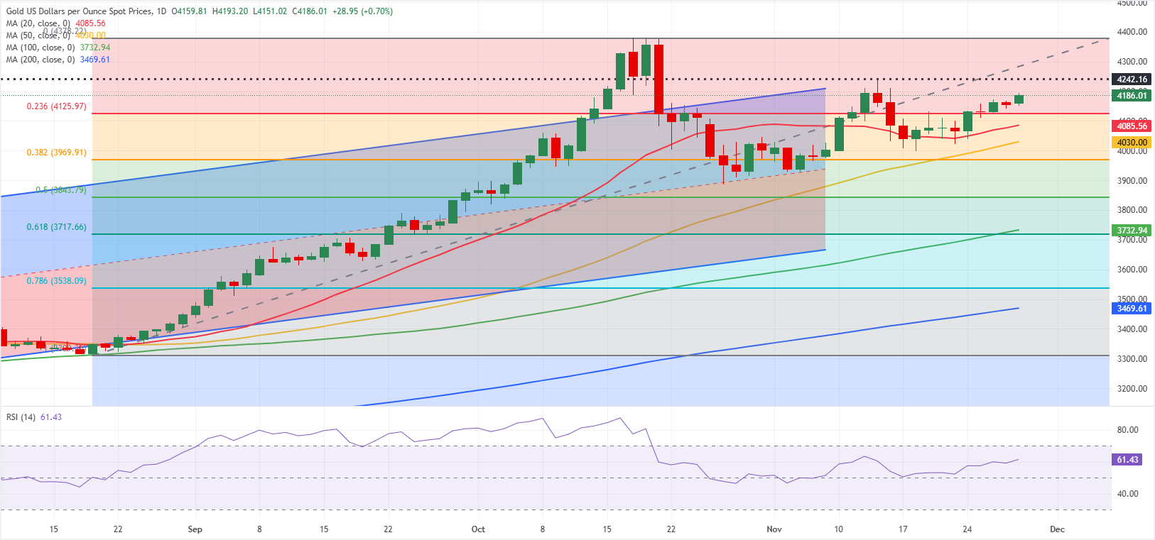 Технический анализ указывает на бычью позицию в краткосрочной перспективе, но пока не подчеркивает укрепление импульса. На дневном графике золото уверенно держится выше 20-дневной простой скользящей средней (SMA) и уровня 23,6% коррекции Фибоначчи восходящего тренда августа-октября, расположенного на уровне $4 125. Кроме того, индекс относительной силы (RSI) движется в боковом направлении около 60.
