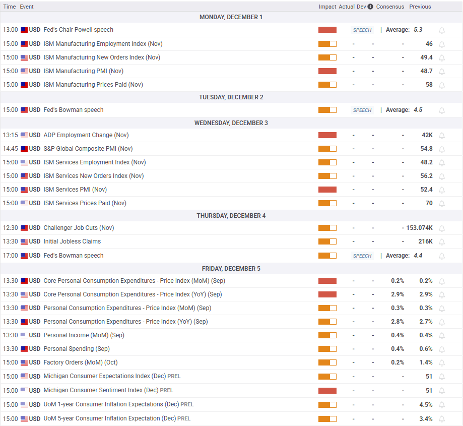 Чиновники ФРС не смогут комментировать перспективы политики до заседания 9-10 декабря. Поэтому инвесторы будут внимательно следить за публикациями данных из США, чтобы подтвердить или пересмотреть вероятность снижения ставки.