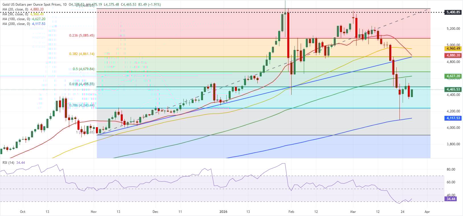 С точки зрения роста первое сопротивление может быть обнаружено на уровне $4 500 (коррекция Фибоначчи 61,8%) перед $4 625 (100-дневная SMA). Если XAU/USD поднимется выше этого уровня и начнет использовать его в качестве поддержки, технические продавцы могут отойти в сторону. В этом сценарии следующей преградой может стать $4 680 (коррекция Фибоначчи 50%) перед $4 860 (коррекция Фибоначчи 38,2%).