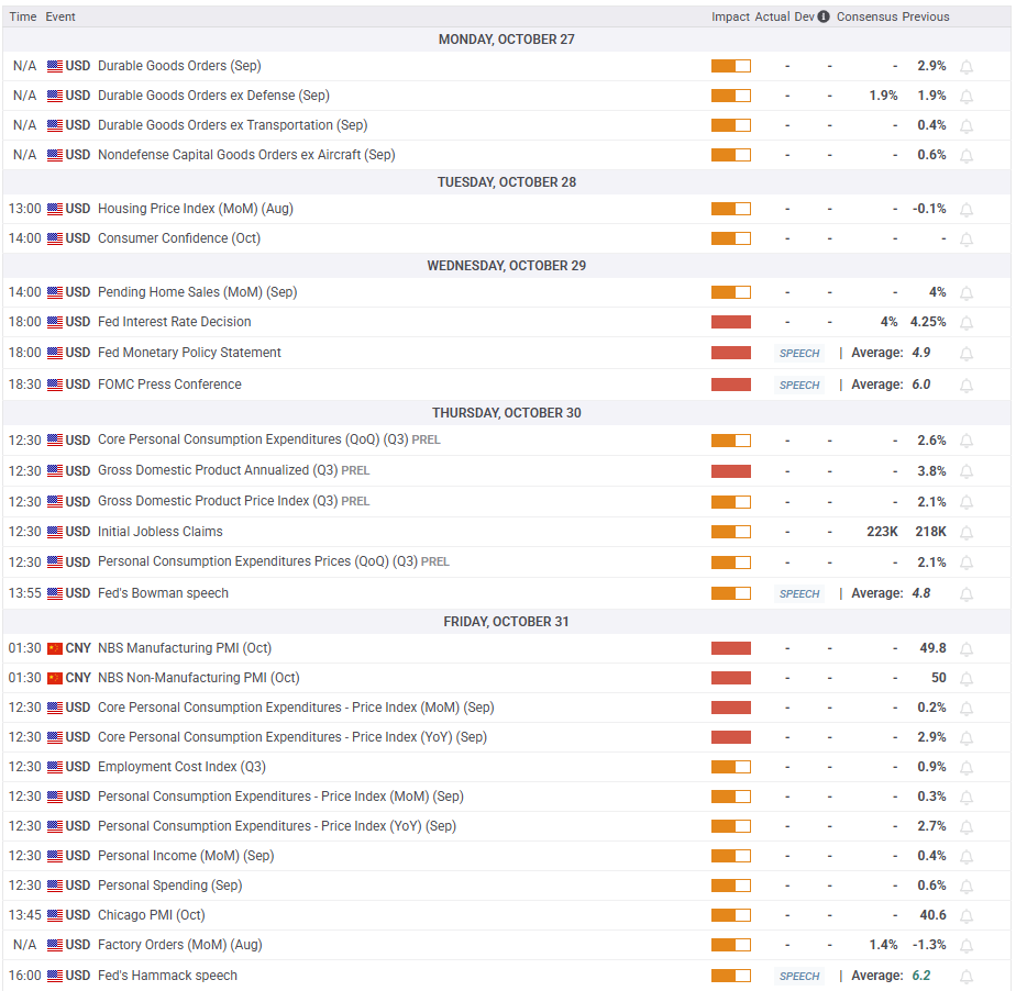 Форум Азиатско-Тихоокеанского экономического сотрудничества (APEC) пройдет в Южной Корее с 30 октября по 1 ноября. Ожидается, что президент Китая Си Цзиньпин и президент Трамп встретятся, чтобы обсудить торговые отношения. Если стороны смогут избежать эскалации конфликта, достигнув соглашения по предложенным Китаем экспортным ограничениям на редкоземельные металлы и увеличенным тарифным угрозам со стороны США, золото может потерять интерес как безопасный актив и продолжить ослабление. Напротив, золото может начать расти, если встреча Си-Трампа будет отменена или если стороны не смогут найти компромисс для продления торгового перемирия.