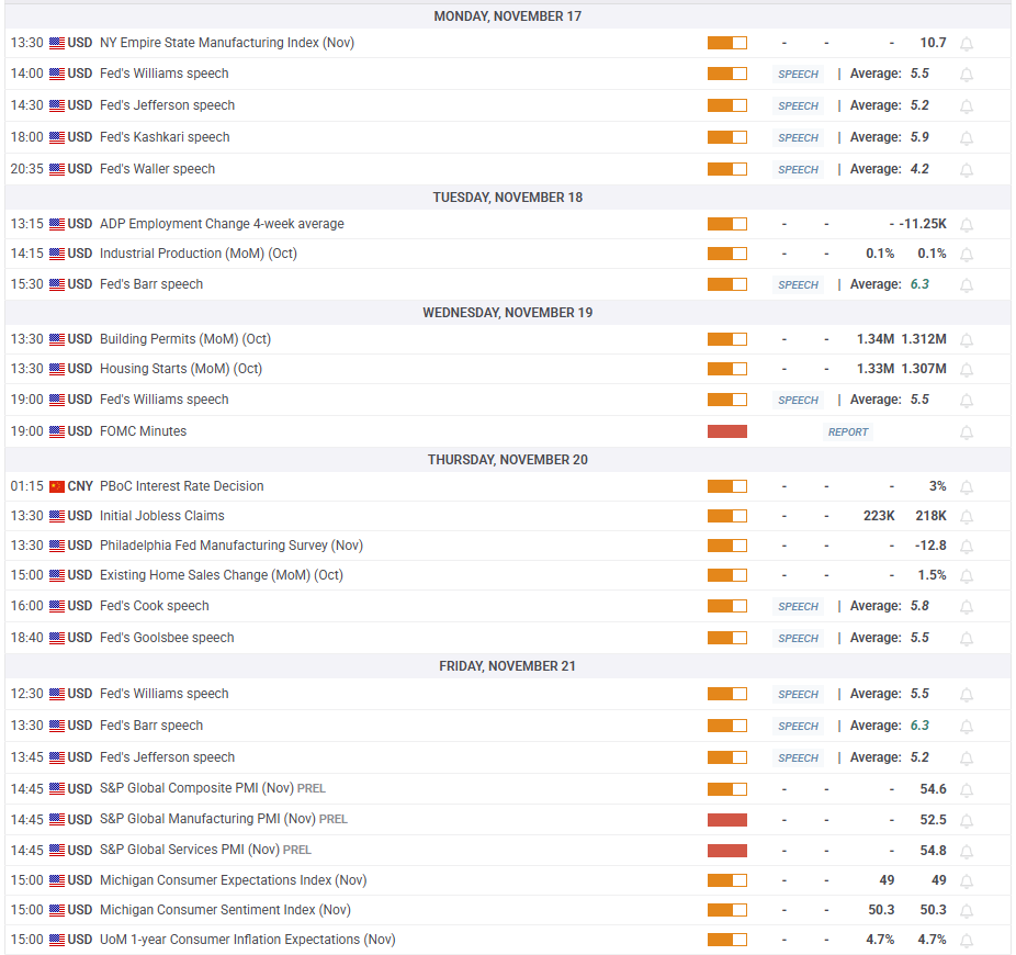 Комментарии чиновников ФРС продолжат привлекать внимание рынков в краткосрочной перспективе. Если политики сделают больший акцент на проблемах рынка труда, чем на прогнозе инфляции, рынки могут воспринять это как подтверждение дальнейшего смягчения политики. Напротив, USD, вероятно, сохранит свою силу и окажет давление на XAU/USD, если чиновники центрального банка предложат, что они могут решить удерживать ставки на уровне в декабре и дождаться данных, чтобы получить более четкую картину текущего состояния экономики.