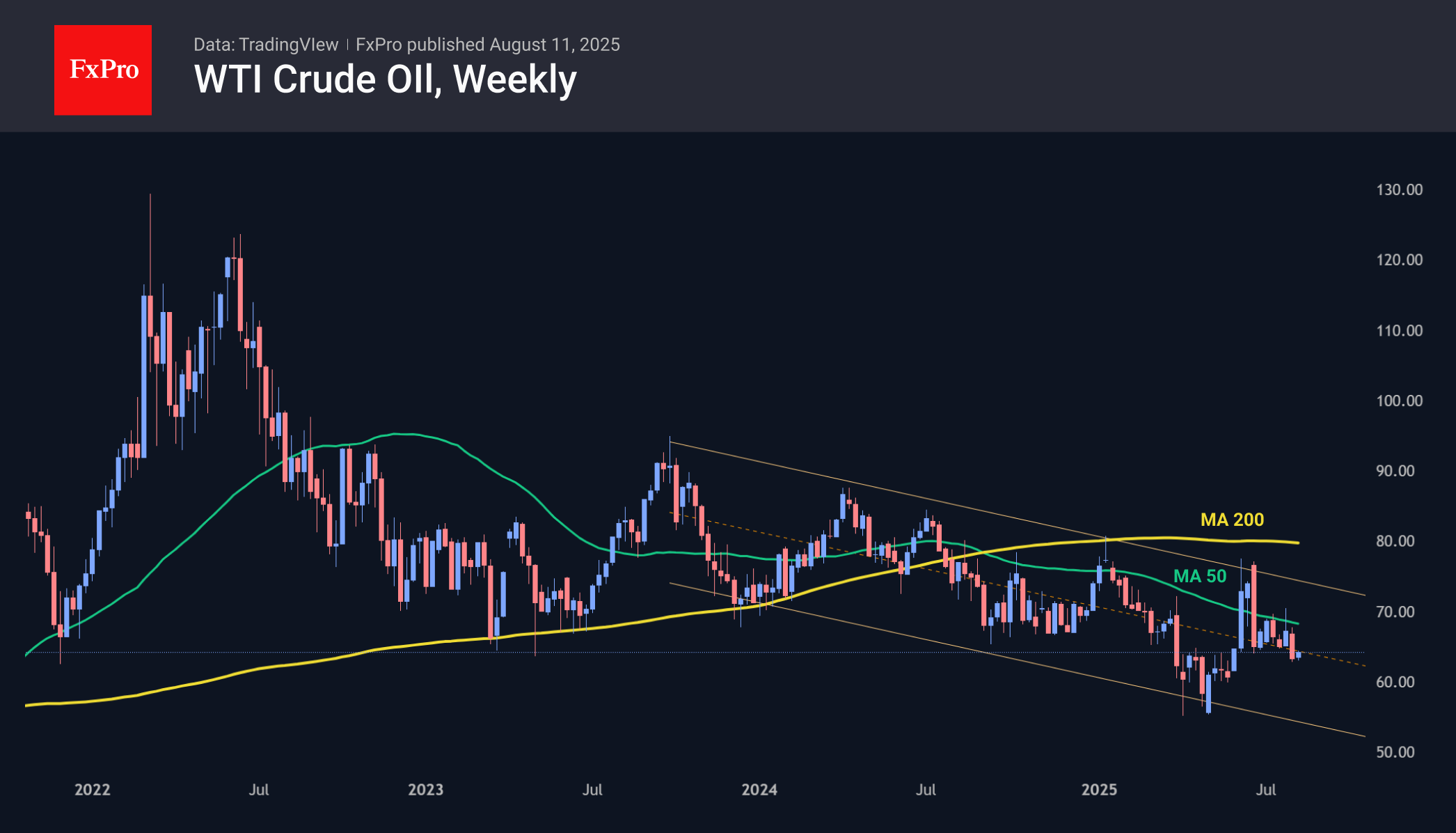 Рост нефти в понедельник выглядит техническим отскоком после значительного спада, отправившего цену в середину диапазона с сентября 2023 года. Пару недель назад 50-недельная скользящая средняя в очередной раз подтвердила свою силу в качестве сопротивления, настраивая на развитие снижения к нижней границе коридора и потенциальным обновлением минимумов июня у $55 за баррель WTI до конца года.