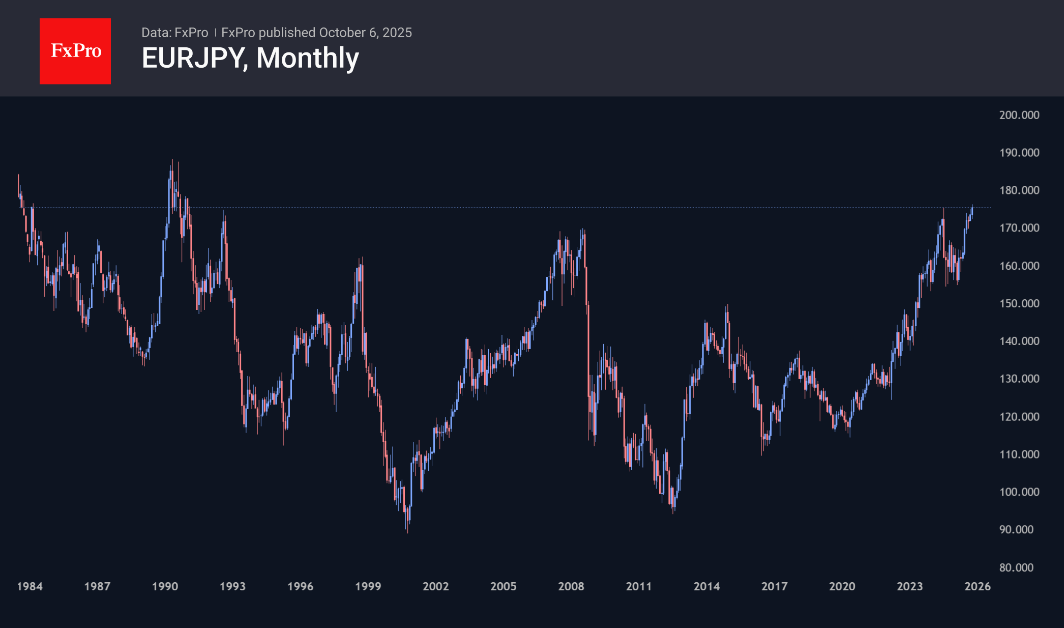Реакция рынков наглядно показывает, что они считают Такаити новым премьером. Если она не изменит своих политических взглядов (а она их несколько смягчила последнее время ради победы на внутрипартийных выборах), стоит быть готовым к дальнейшему ослаблению иены, которая в паре EURJPY достигала максимума с 1991 года превышая отметку 176.