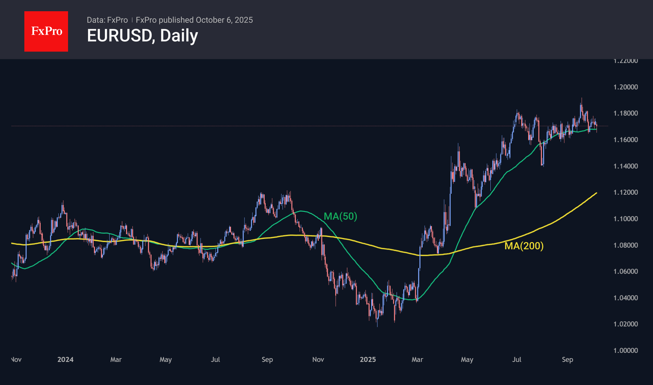 В Японии Санаэ Такаити на выходных была избрана главой Либерально-демократической партии и на пути, чтобы стать первым в истории страны женщиной премьер-министром. Это событие обваливало иену на 2% до 150.49 от уровня пятницы, прежде чем скорректироваться до 149.80 на момент написания. Такаити считается сторонником агрессивных госрасходов, структурных реформ и мягкой монетарной политики, повторяя основные принципы Синдзо Абэ. В целом у неё более правый подход к национальной политике, также она сторонник пересмотра пацифистской конституции Японии.