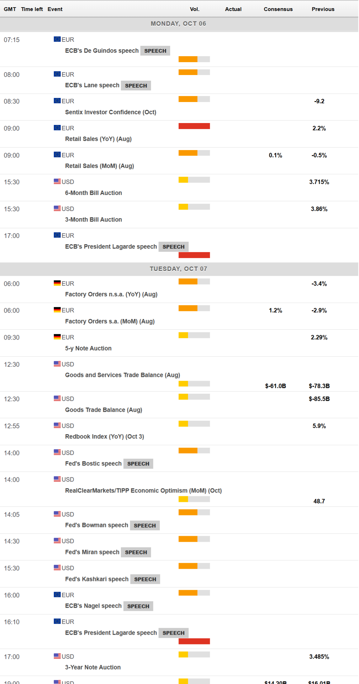 Еврозона опубликует индекс доверия инвесторов Sentix за октябрь и данные по розничным продажам за август в понедельник, в то время как различные представители ЕЦБ, включая президента Кристин Лагард, будут выступать с комментариями на протяжении всей недели.
