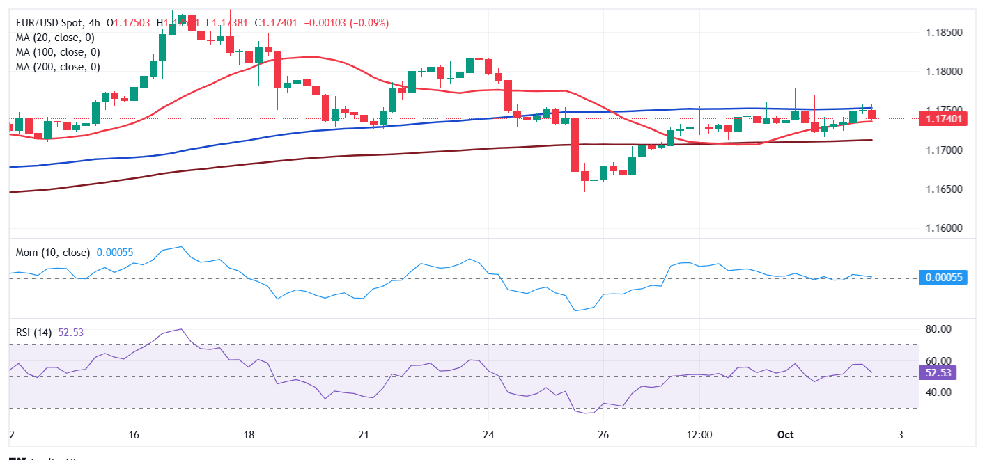 На 4-часовом графике пары EUR/USD видно, что продавцы остаются сосредоточенными вокруг плоской 100-дневной SMA, в то время как покупатели защищают пару от снижения в районе также ненаправленной 200-дневной SMA. 20-дневная SMA, тем временем, находится плоской посередине между более длинными. Наконец, индикатор моментума отступает после пересечения своей средней линии, входя на положительную территорию, в то время как индекс относительной силы (RSI) также направлен вниз на уровне около 51, что указывает на ограниченный спекулятивный интерес к паре.
