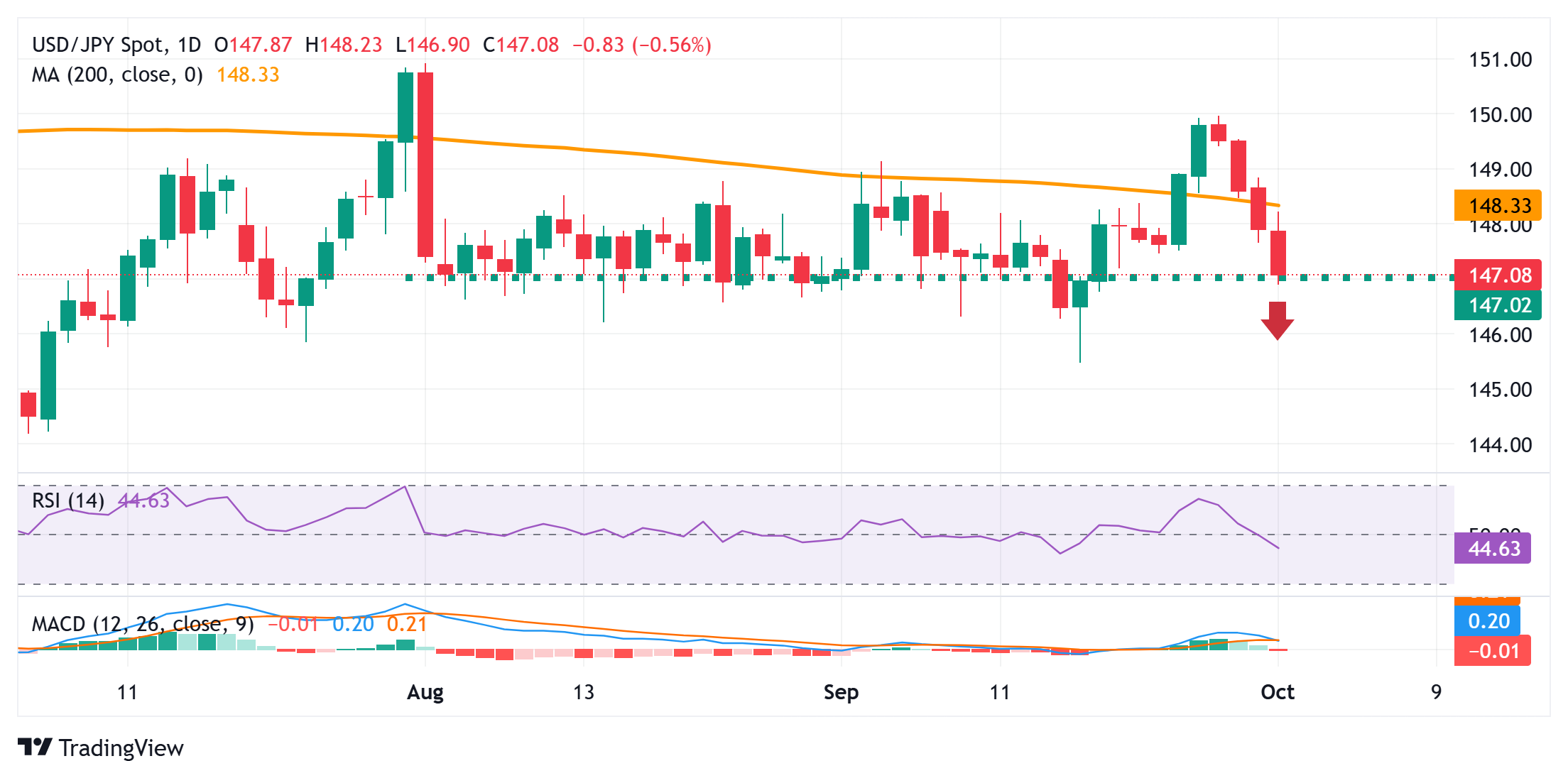 С технической точки зрения, внутридневной рост пары USD/JPY в начале этой среды ослаб перед 200-дневной простой скользящей средней (SMA), и последующее падение подтверждает негативный прогноз. Более того, осцилляторы на дневном графике снова начали набирать негативный импульс. Некоторые последующие продажи и закрепление ниже отметки 147,00 создадут условия для падения к поддержке 146,30-146,25. За этим следует круглый уровень 146,00, ниже которого спотовые цены могут нацелиться на повторное тестирование месячного минимума сентября, около 145,50-145,45, прежде чем в конечном итоге упадут к психологической отметке 145,00.