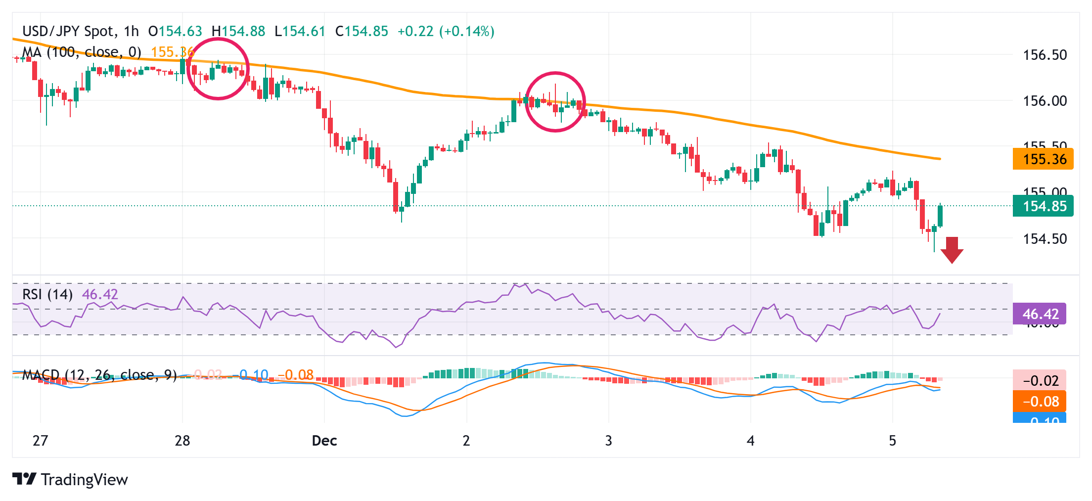 Недавние повторяющиеся неудачи вернуться выше 100-часовой простой скользящей средней (SMA) и принятие ниже психологической отметки 155,00 благоприятствуют медведям по USD/JPY. Более того, технические индикаторы на дневном графике только начали набирать негативный импульс и поддерживают идею о дальнейшем снижении. Таким образом, последующее падение к отметке 154,00, на пути к минимуму середины ноября, около 153,60, выглядит вполне вероятным.