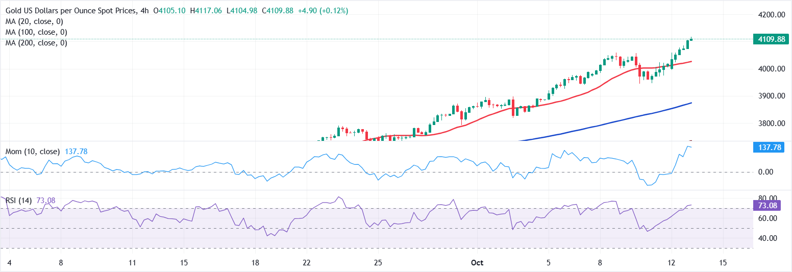 Краткосрочная картина довольно похожа. На 4-часовом графике индикатор Моментума уверенно направлен на север в положительных уровнях, в то время как индекс относительной силы (RSI) продвигается на уровне около 70, хотя с ограниченным восходящим уклоном. Тем временем пара XAU/USD продолжает свое восстановление выше всех своих скользящих средних, причем умеренно бычья 20 SMA в настоящее время составляет около $4 026.