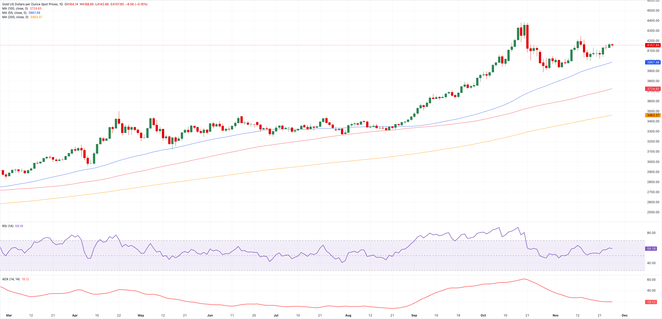 Перед замедлением в связи с Днем благодарения драгоценный металл может просто взять передышку и удержаться в диапазоне $4 150–$4 170. Ликвидность обычно немного снижается, так как американские торговые столы переходят в праздничный режим, поэтому мы можем увидеть более спокойный период, когда трейдеры просто защищают недавние прибыли.