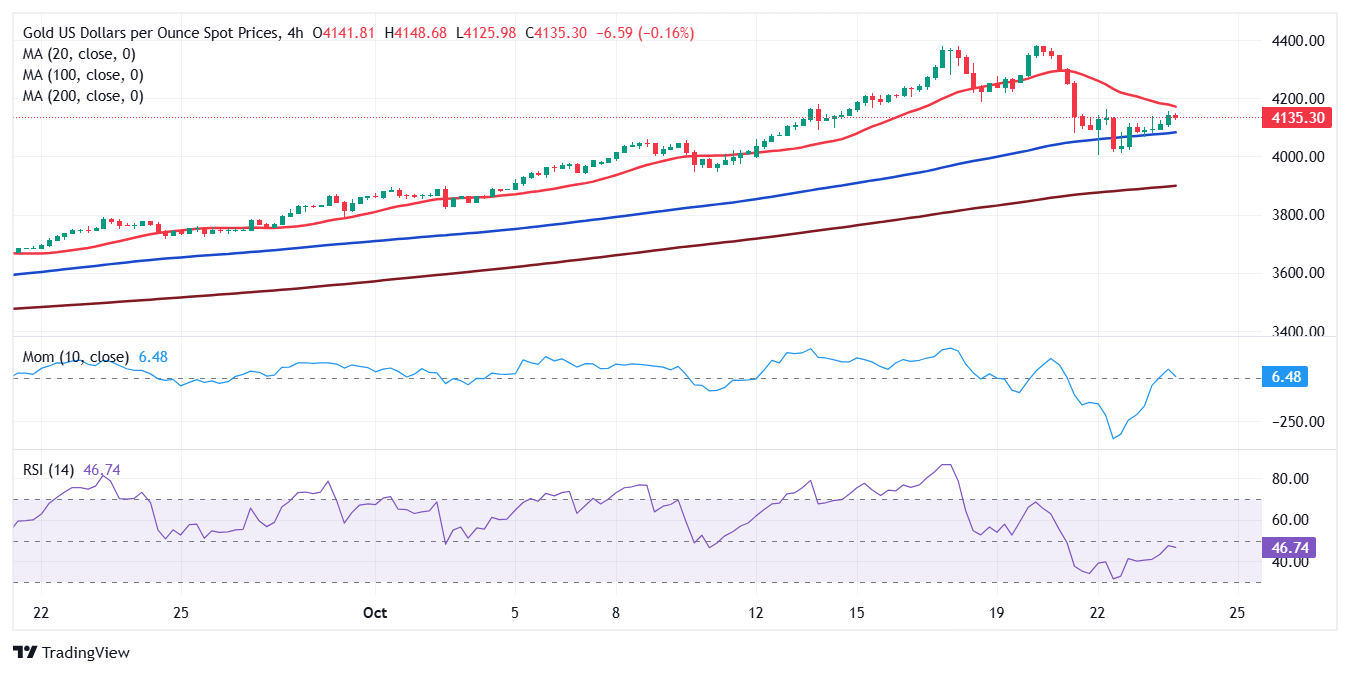 4-часовой график показывает, что пара смогла продлить свое восстановление выше бычьей 100-дневной SMA, в то время как она остается ниже медвежьей 20-дневной SMA, последняя из которых действует как сопротивление на уровне около $4 173. В то же время индикатор Моментума движется в пределах отрицательных уровней, в то время как индекс относительной силы (RSI) колеблется около 47.