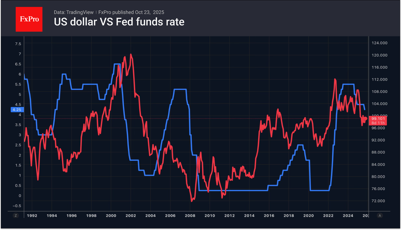 Рынки заложили ожидания пяти снижений ставки в 2025–2026. В прогнозах FOMC фигурировало только три. При этом опасения, что ФРС окажется права, заставляют инвесторов возвращаться к доллару США. Ускорение американской инфляции в сентябре вряд ли отговорит центробанк от снижения ставок в октябре и декабре. Однако затем он может сделать продолжительную паузу. Это оказывает поддержку американской валюте.