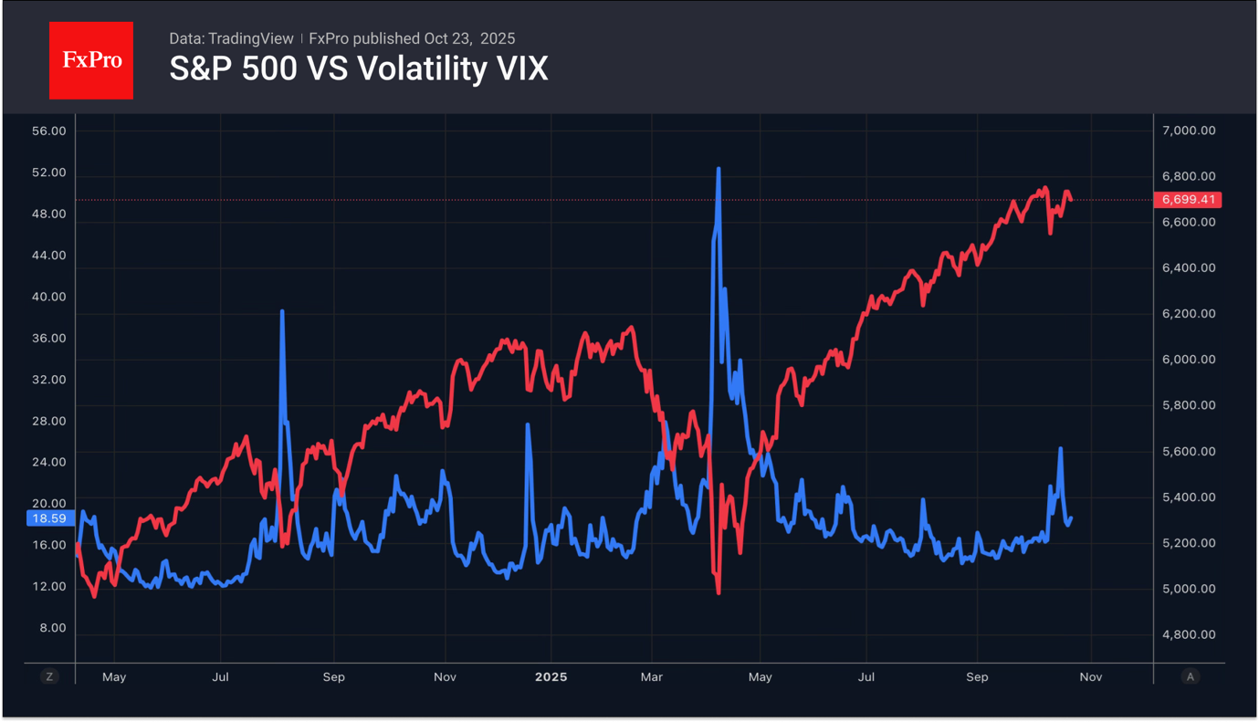 Октябрь оправдывает статус наиболее волатильного месяца года для S&P 500. После самых серьёзных распродаж со Дня освобождения Америки широкий фондовый индекс восстановился, а потом снова упал. На стороне «быков» играют ожидания дальнейшего смягчения политики и позитивная корпоративная отчётность.