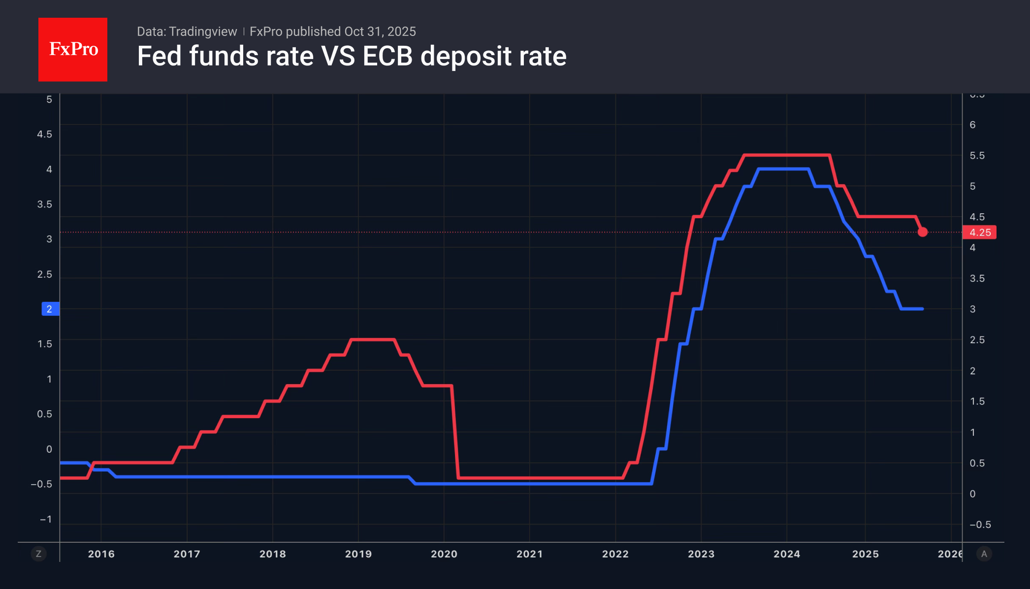 У ЕЦБ нет причин жаловаться на экономику еврозоны. В третьем квартале она ускорилась с 0.5% до 0.9% г/г благодаря постепенной адаптации экспорта к тарифам США, сильному рынку труда, крепким балансам домашних хозяйств и продолжительному циклу снижения ставок.