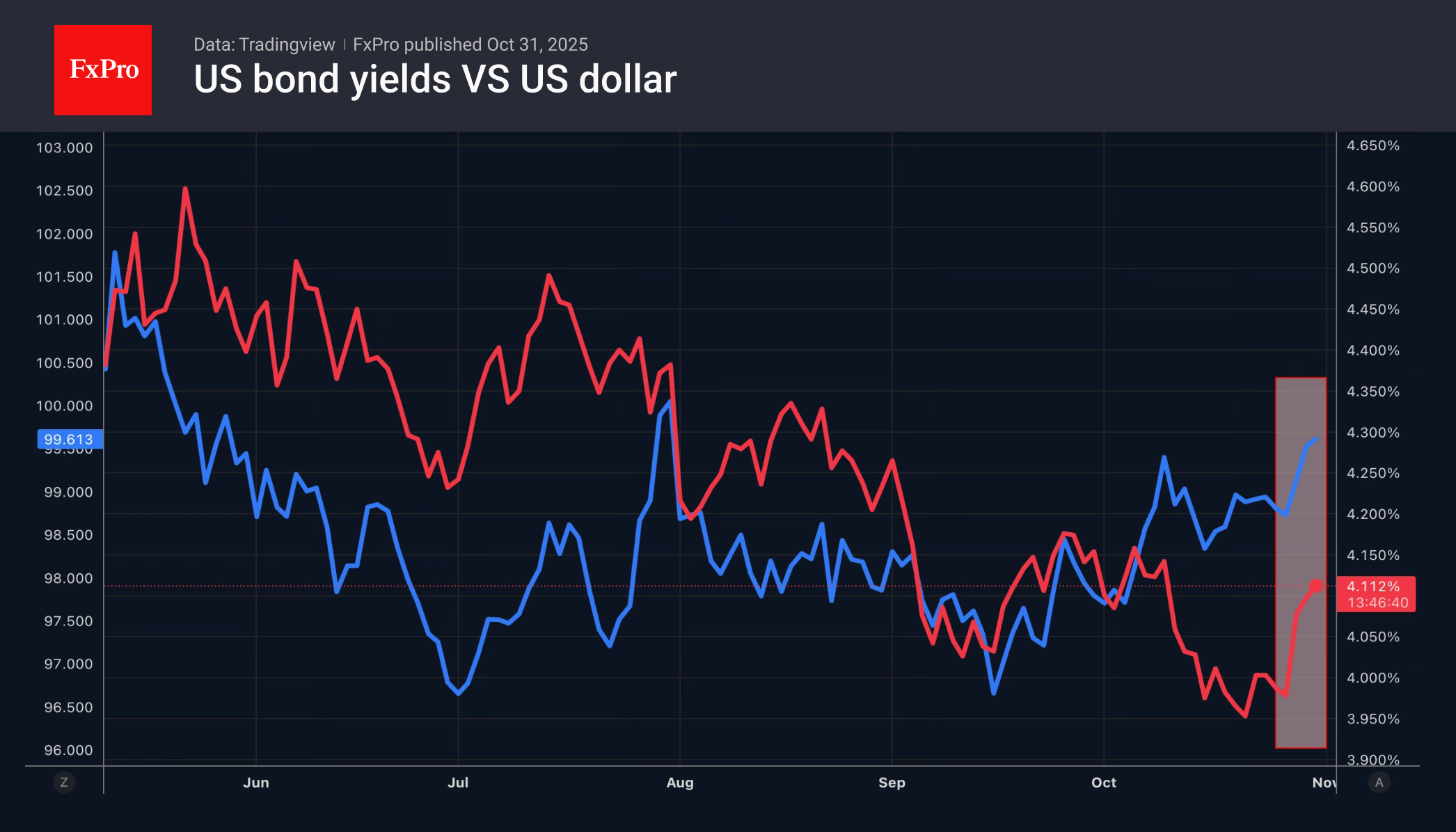 Напротив, шансы на сокращение ставки ФРС в декабре упали с более чем 90% на старте недели до 67%. Одновременно растёт доходность казначейских облигаций, что оказывает поддержку американскому доллару.