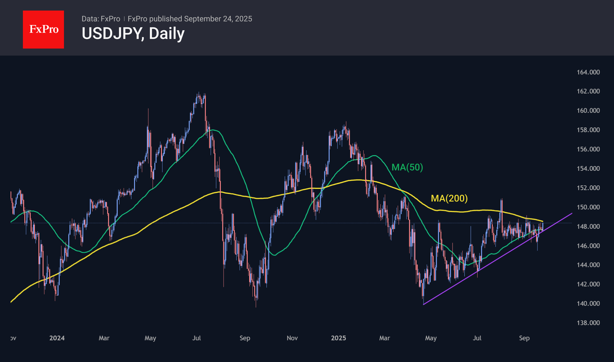 USDJPY также близка к столкновению со своей 200-дневной средней у 148.3, торгуясь вблизи области максимумов с июля. В начале сентября мы видели попытку пары развить нисходящую тенденцию, но она была остановлена довольно мягким настроем Банка Японии и укреплением доллара к иене после заседания ФРС в середине прошлой недели. Через минимумы апреля и начала июля в USDJPY проходит повышательная тенденция, попытка сломить которую не увенчалась успехом 17 сентября. Рост пары выше 149 будет важным техническим прорывом, но широкое внимание медиа и розничных трейдеров может прийти только после роста выше 150, повторив восхождения 2024 года с потенциальным пиком на 158–160.
