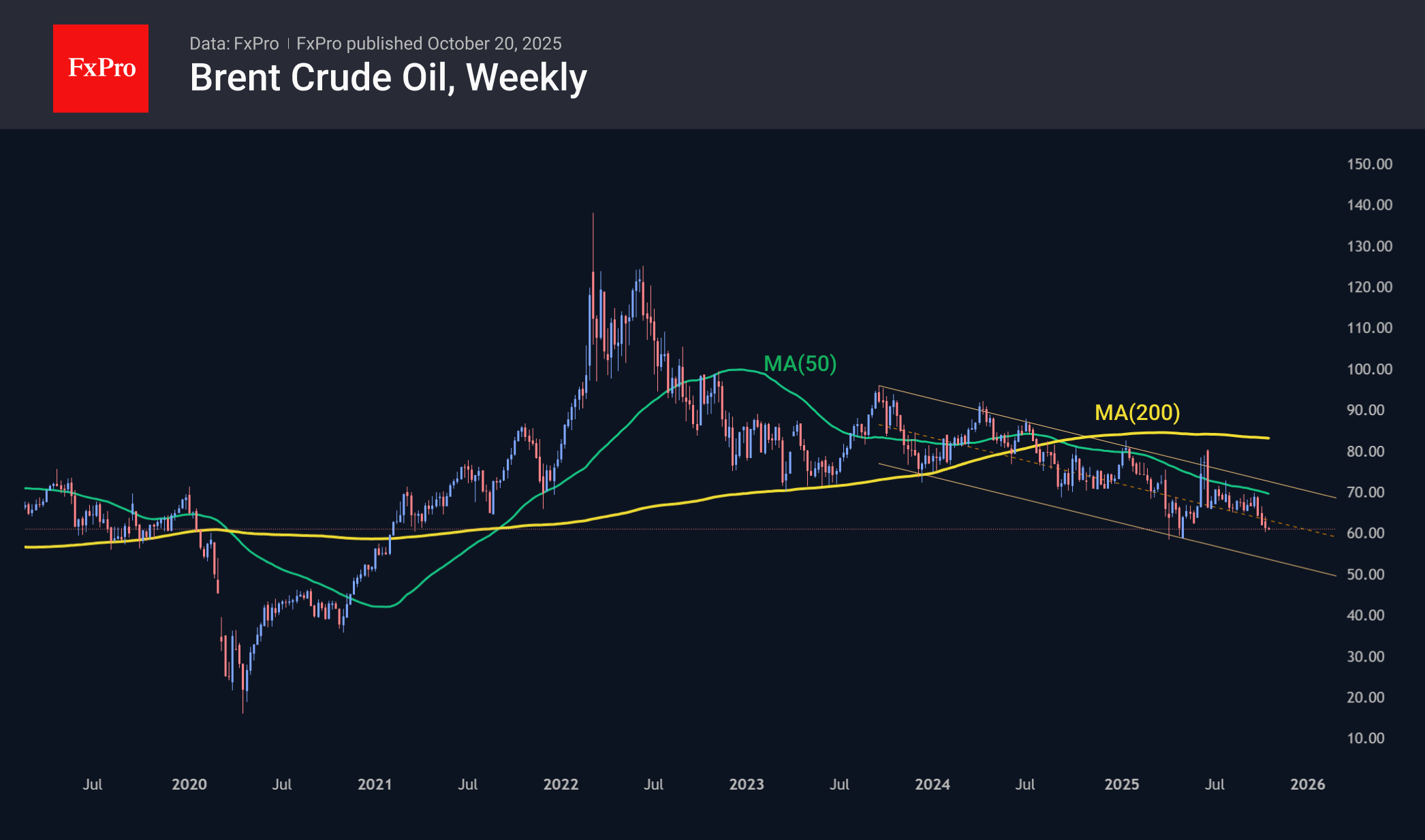 Цена на нефть находится в нисходящем коридоре чуть более трёх лет, а в конце сентября усилила снижение на приближении к 50-недельной скользящей средней и верхней границы диапазона. Нижняя граница этого диапазона сейчас проходит вблизи $53 за баррель Brent со снижением к концу года ближе к $50.50 против текущих $61.00.