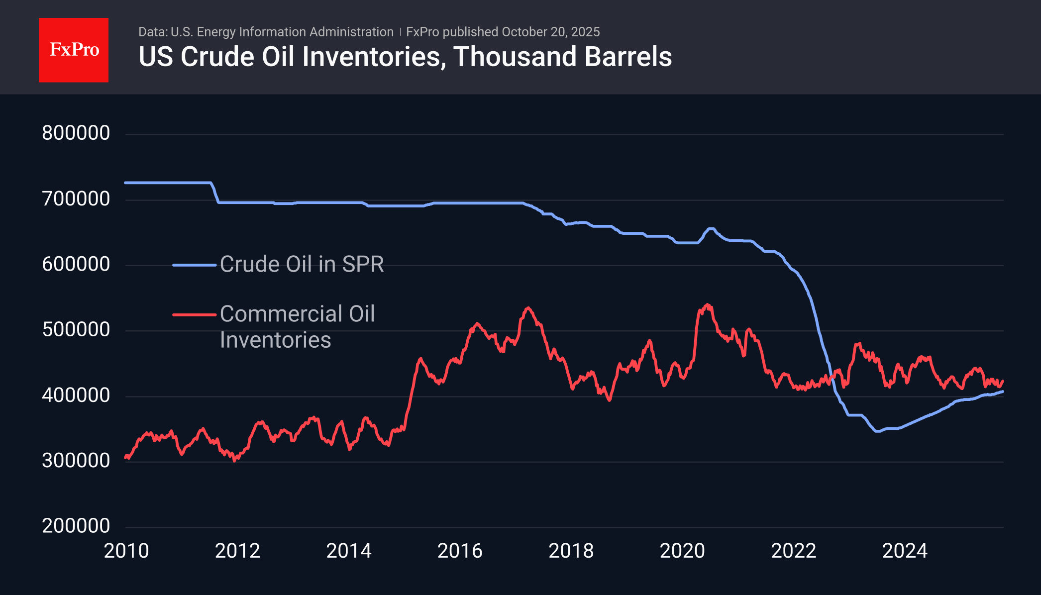 Стабилизирующим фактором выступают показатели запасов. Коммерческие запасы в США при этом у нижней границы диапазона последнего десятилетия, но примерно такими же низкими они были в январе 2020 года, но уже через полгода этот показатель обновил рекорд. Однако без коллапса потребления не стоит ожидать столь быстрого роста. Также правительство США может перейти к более активному восстановлению стратегического резерва, распроданного в 2022 году.
