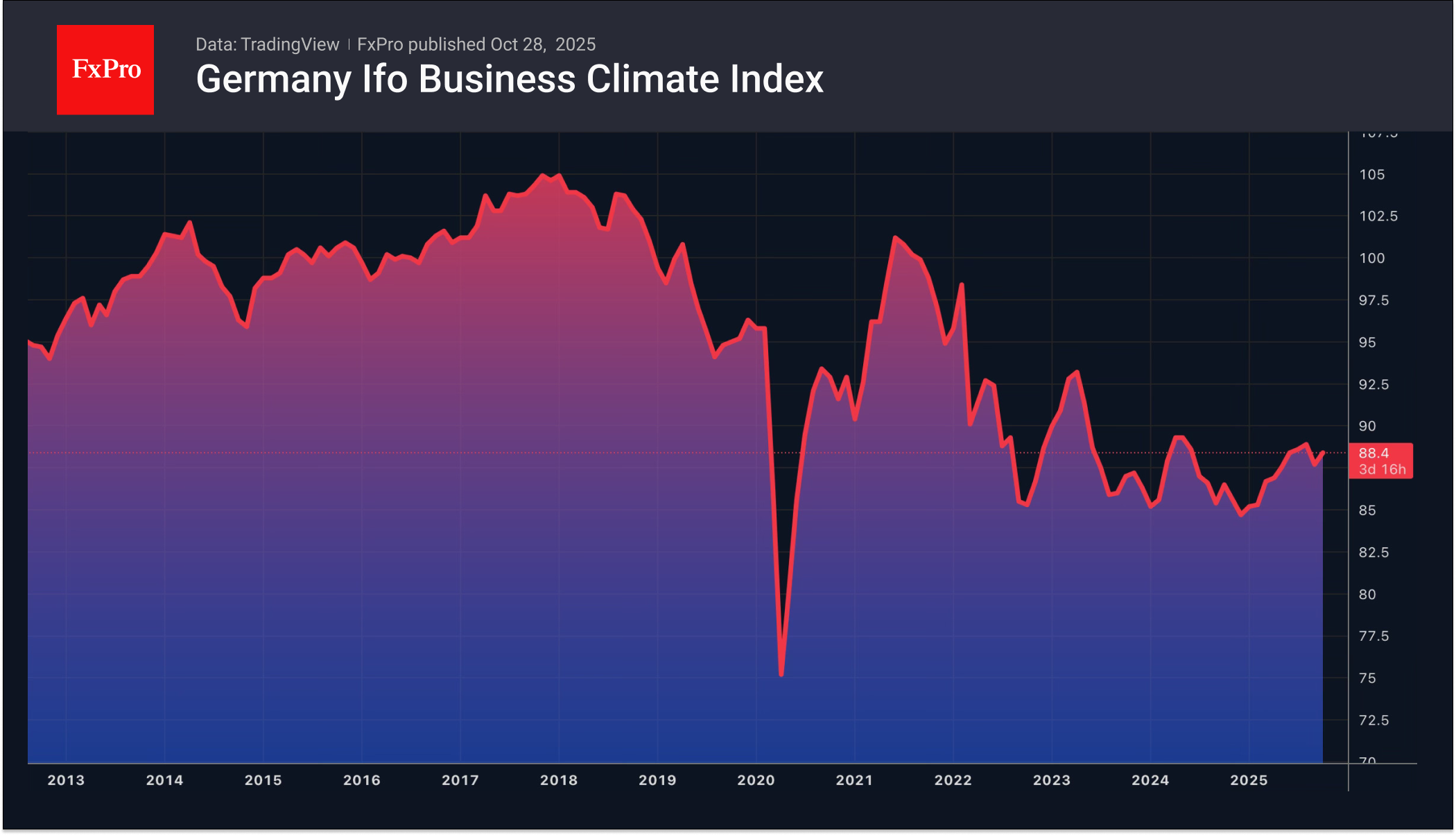 Часть экспертов Bloomberg прогнозируют повышение ставок в 2026. Для этого необходимо улучшение европейской экономики. Приятные сюрпризы от деловой активности еврозоны и немецких бизнес-настроений свидетельствуют о позитивной динамике ВВП в четвёртом квартале. В июле-сентябре валовой валовый продукт, вероятнее всего, расширился на 0,1%.